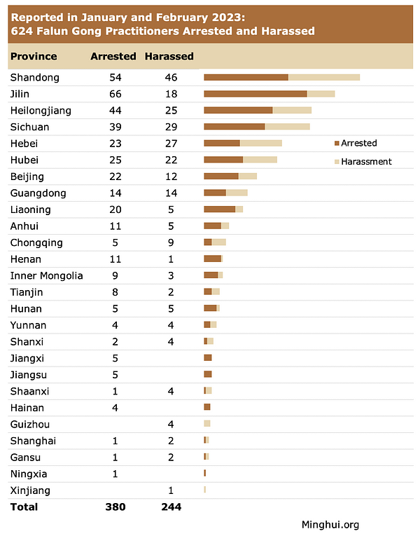 U januaru i februaru 2023. godine prijavljena su ukupno 624 slučaja hapšenja ili maltretiranja Falun Gong praktikanata zbog svoje vjere