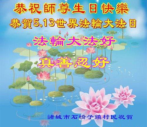 Građani okruga Pingšan, provincija Hebei, imali su ogromnu korist od Falun Dafe: „Osećamo se kao najsrećniji ljudi na svetu“, napisali su u čestitki. „Takođe želimo da više ljudi zna šta je Falun Dafa i šta je istina, umesto da budu zavedeni propagandom KPK. Imajte na umu „Falun Dafa je dobra“ i „Istinitost-Blagost-Trpeljivost su dobri“.“