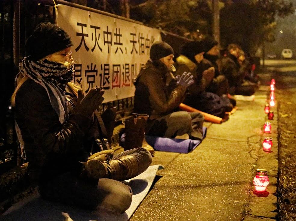 Slovački praktikanti su dočekali novu 2014. godinu ispred kineskog veleposlanstva u Bratislavi. Svijetlo svijeća je osvjetljavalo natpise ispred kojih je grupa praktikanata radila Falun Gong vježbe.