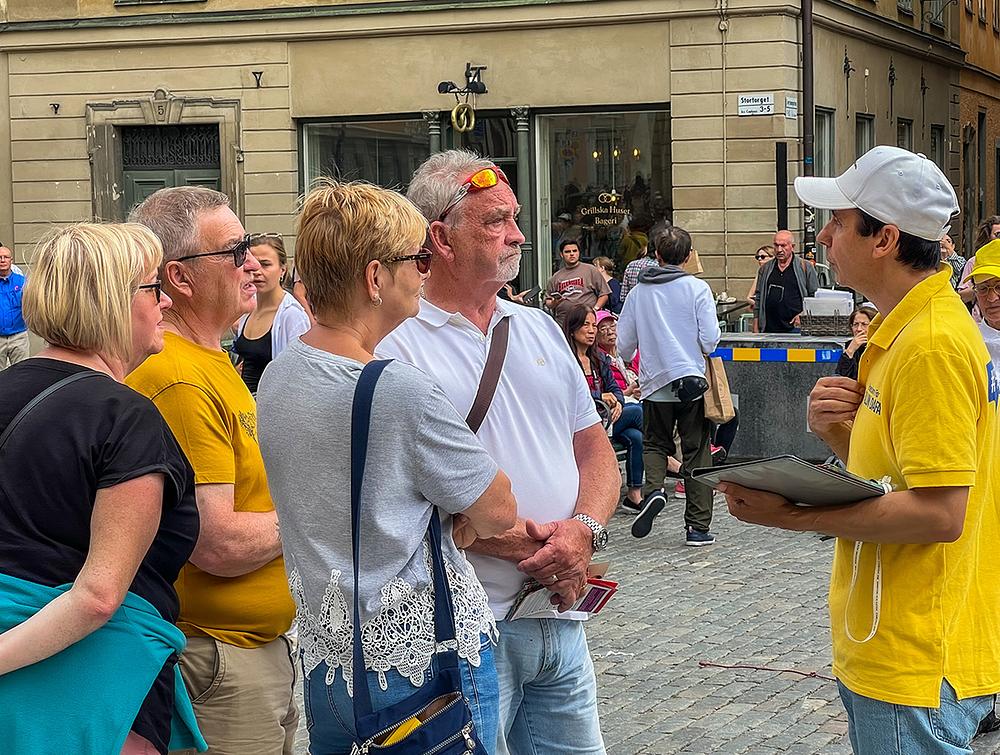 Falun Dafa praktikanti su održali informativne događaje ispred Muzeja Nobelove nagrade u Stockholmu svake subote poslijepodne u srpnju 2023. Mirna atmosfera dok su izvodili vježbe privukla je mnoge ljude, koji su zastali da saznaju više o Falun Dafa. Nakon što su čuli za brutalni progon Falun Dafa u Kini, potpisali su peticiju kojom pozivaju na prekid zločina. Nekoliko ljudi je reklo da su zainteresirani za učenje Falun Dafa vježbi.