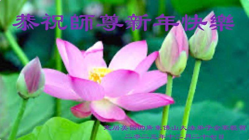 Cijela obitelj Falun Dafa praktikanata iz Foshana, provincije Guangdong, koji su se nastanili u Sjedinjenim Državama, želi Učitelju sretnu Novu godinu!