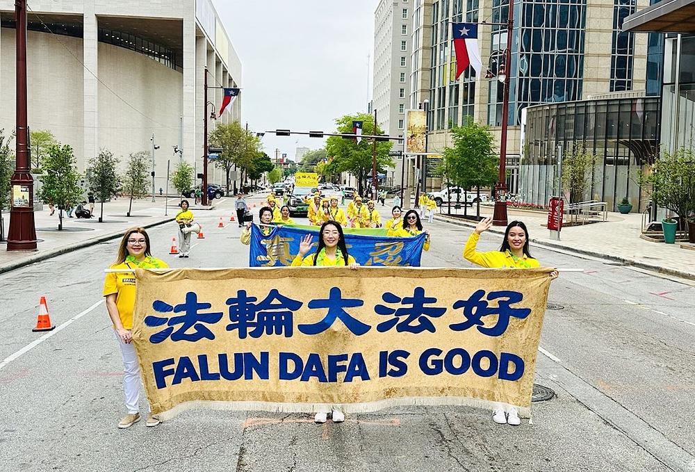 Falun Dafa praktikanti su bili pozvani da učestvuju na 63. paradi na Dan Svetog Patrika u Hjustonu održanoj 16. marta 2024. Njihovi transparenti, doboši i upečatljivi pokretni splav sa pipa sviračem i ljudima koji su demonstrirali vježbe su bili toliko impresivni da su ih gledaoci dočekali poklicima odobravanja, a također su i fotografisali povorku. Gledaocima su također uručeni letci sa informacijama o ovoj drevnoj praksi kultivacije.