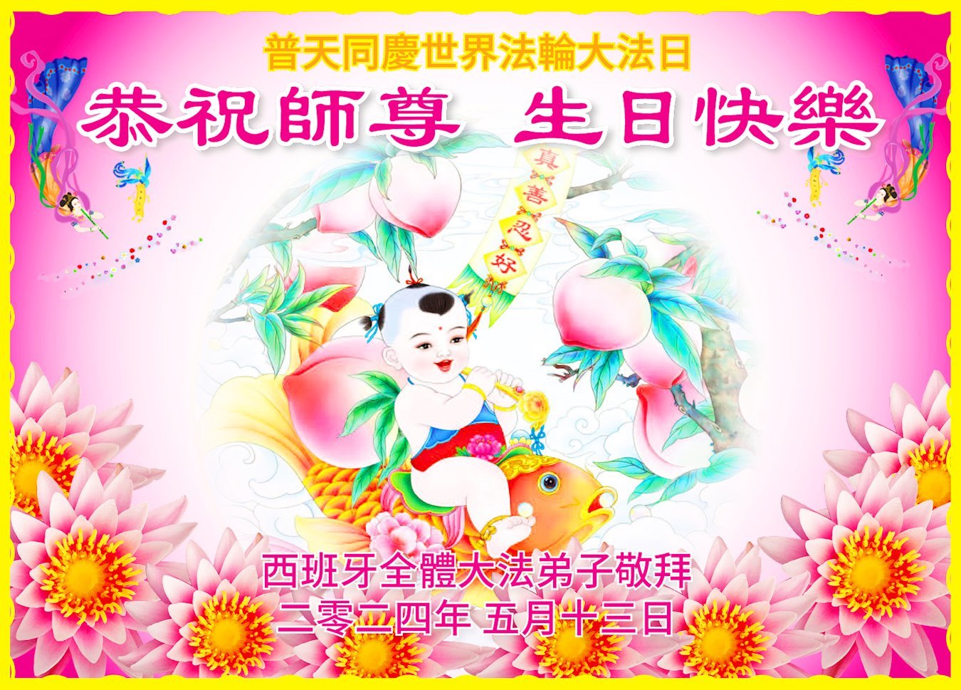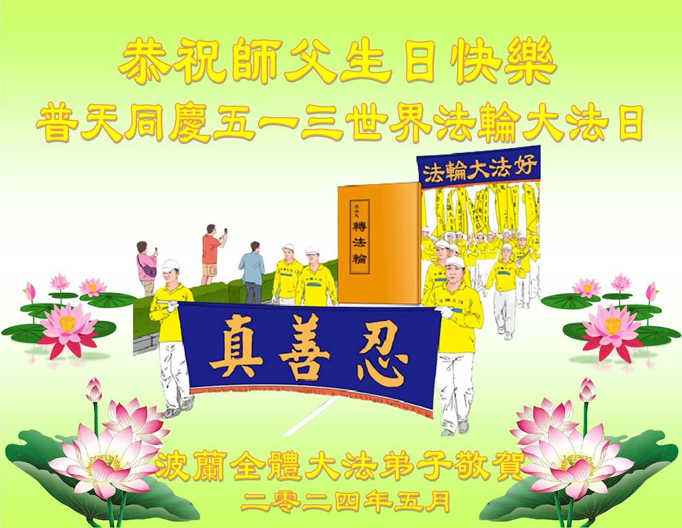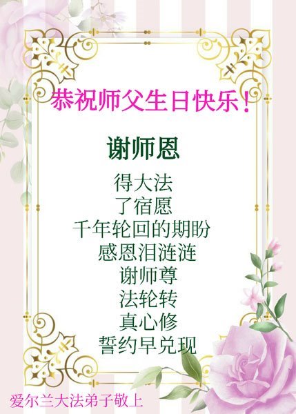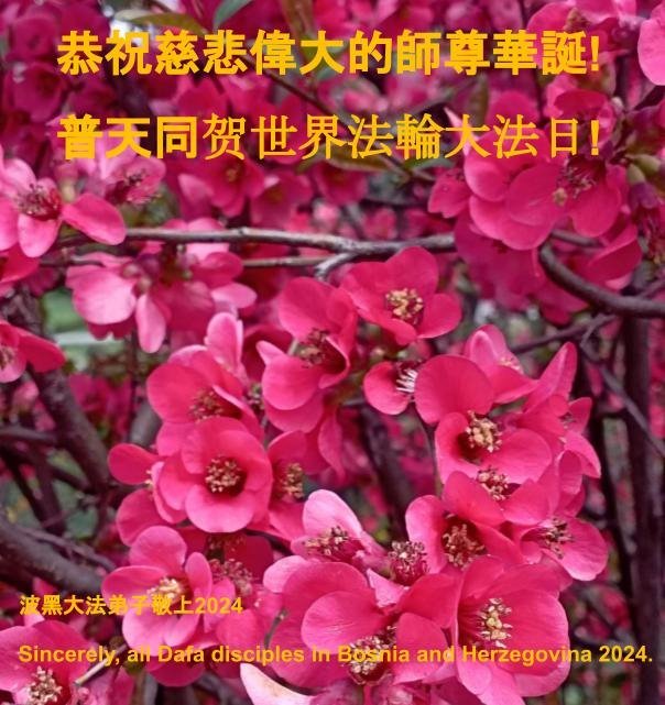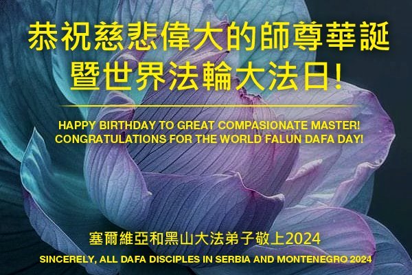 Mladi praktikanti iz Irske žele sretan rođendan Učitelju Liju!Bugarski praktikanti slave Svjetski dan Falun Dafa.Indijski praktikanti žele sretan rođendan Učitelju Liju!Španski praktikanti slave Svjetski dan Falun Dafa.Čestitka iz Srbije i Crne GorePraktikanti iz Hualiena, Tajvan, iskreno žele Učitelju Liju sretan rođendan!Čestitka praktikanata iz Južne KorejePraktikanti iz Irske su poslali stihove: