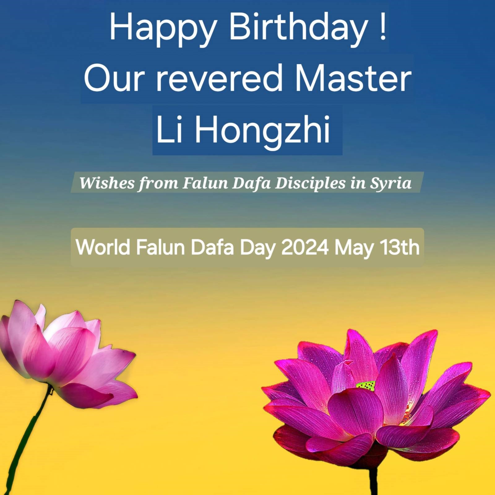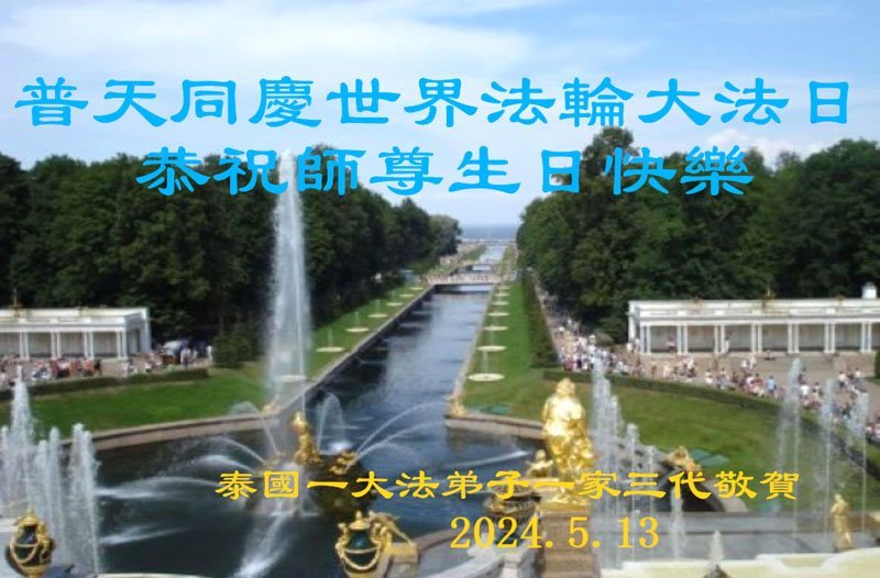 Portugalski praktikanti čestitaju rođendan Učitelju Liju!Praktikanti iz francuskog govornog područja u Švicarskoj slave Svjetski dan Falun Dafa.Ruski praktikanti žele sretan rođendan Učitelju Liju!Primljene su čestitke i od praktikanata iz Turske.Praktikanti iz Tajlanda žele sretan rođendan Učitelju Liju!Praktikanti iz Jermenije žele Učitelju Liju srećan rođendan!Čestitke su primljne i iz Newcastlea, Ujedinjeno Kraljevstvo.Škotski praktikanti žele sretan rođendan Učitelju Liju!Primljene su čestitke i praktikanata iz Singapura.