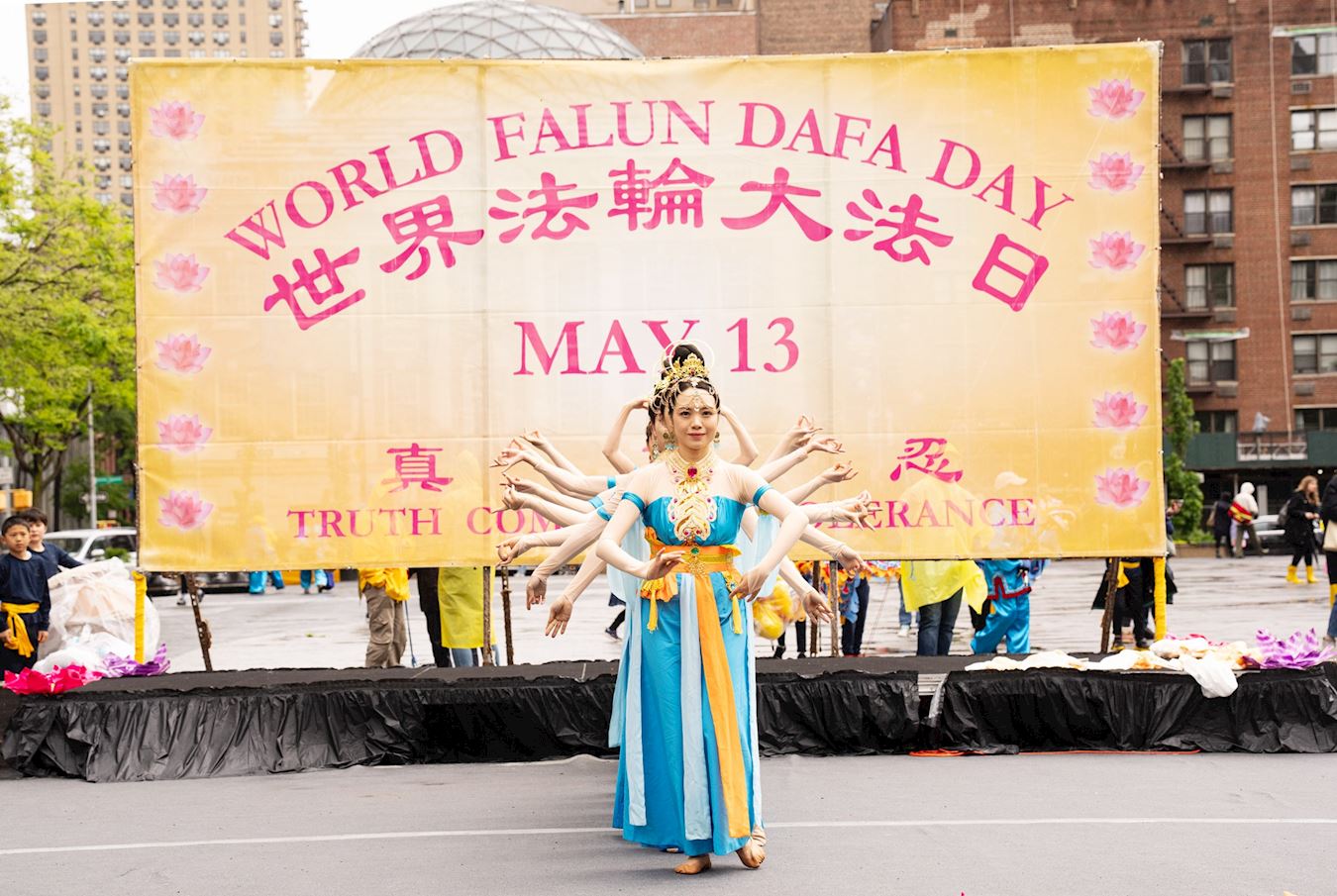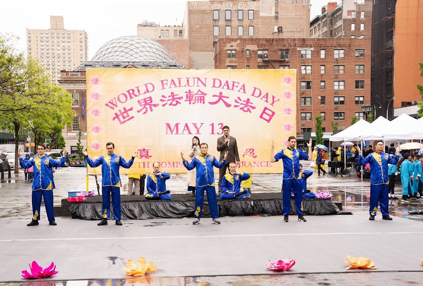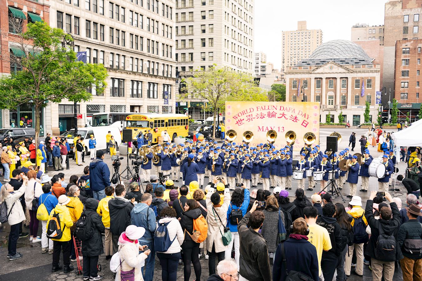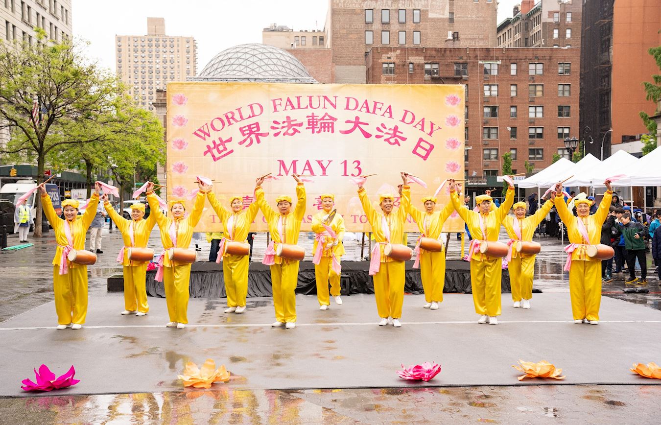 Praktikanti iz New Yorka donijeli su glazbu i ples na Union Square, Manhattan, 12. svibnja kako bi proslavili 32. godišnjicu predstavljanja Falun Dafa svijetu i 25. Svjetski dan Falun Dafa. Budući da su imali koristi od Falun Dafa fizički i duhovno, također su iskreno zaželjeli sretan rođendan svom osnivaču, Učitelju Li-ju.