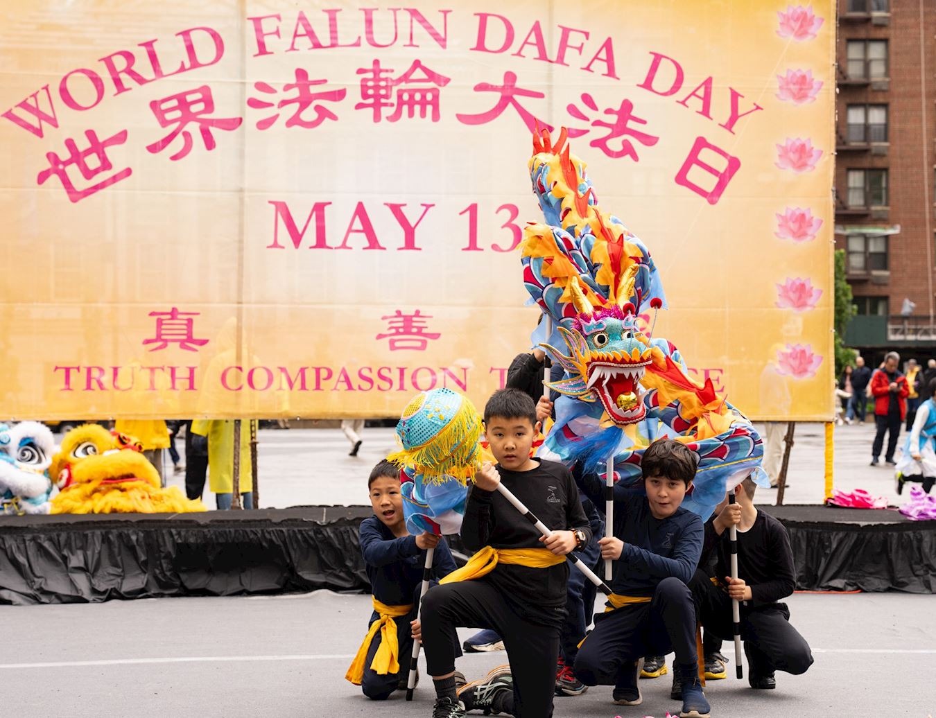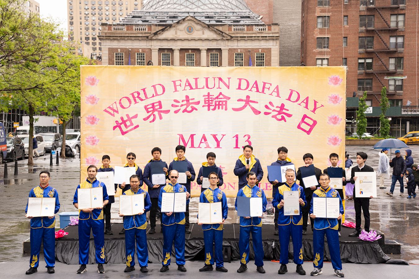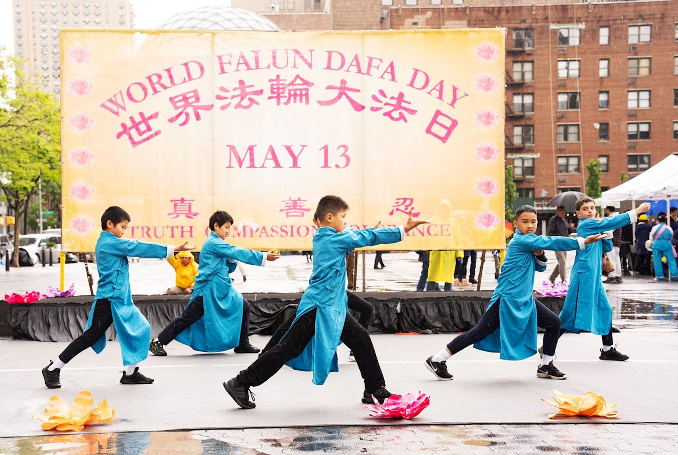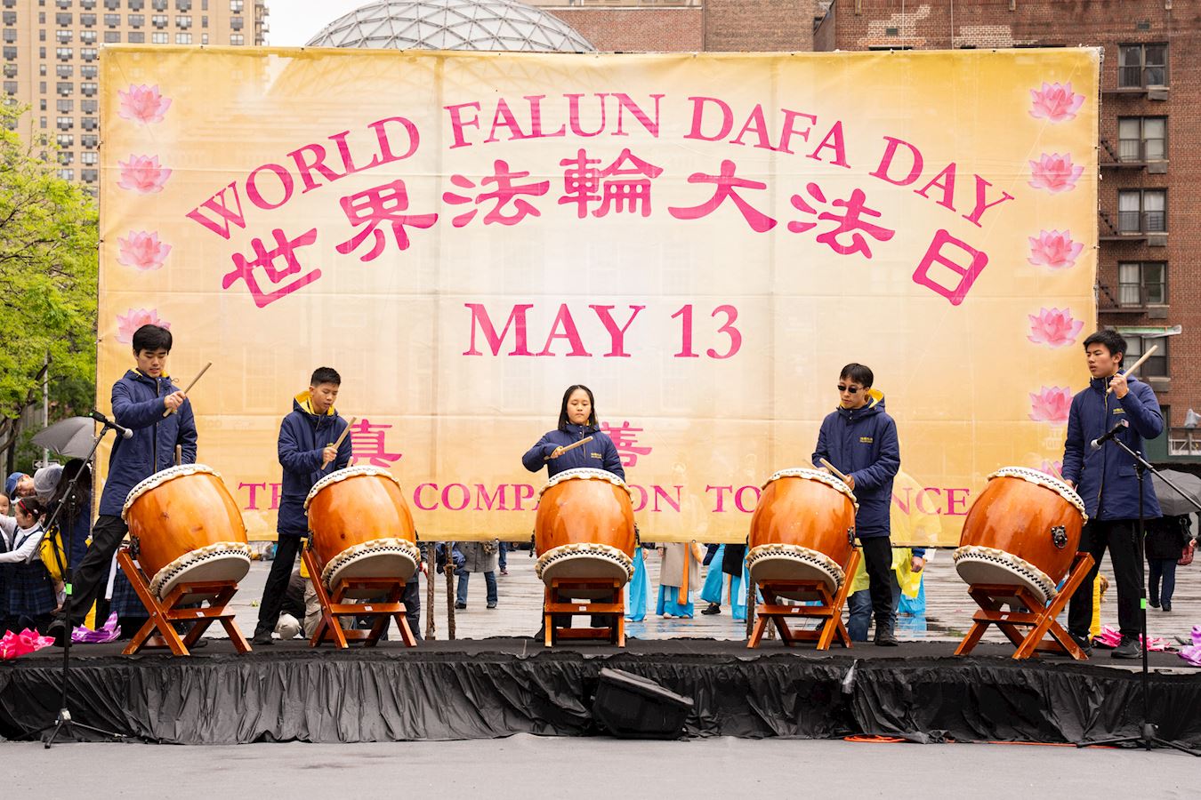 Praktikanti iz New Yorka donijeli su glazbu i ples na Union Square, Manhattan, 12. svibnja kako bi proslavili 32. godišnjicu predstavljanja Falun Dafa svijetu i 25. Svjetski dan Falun Dafa. Budući da su imali koristi od Falun Dafa fizički i duhovno, također su iskreno zaželjeli sretan rođendan svom osnivaču, Učitelju Li-ju.