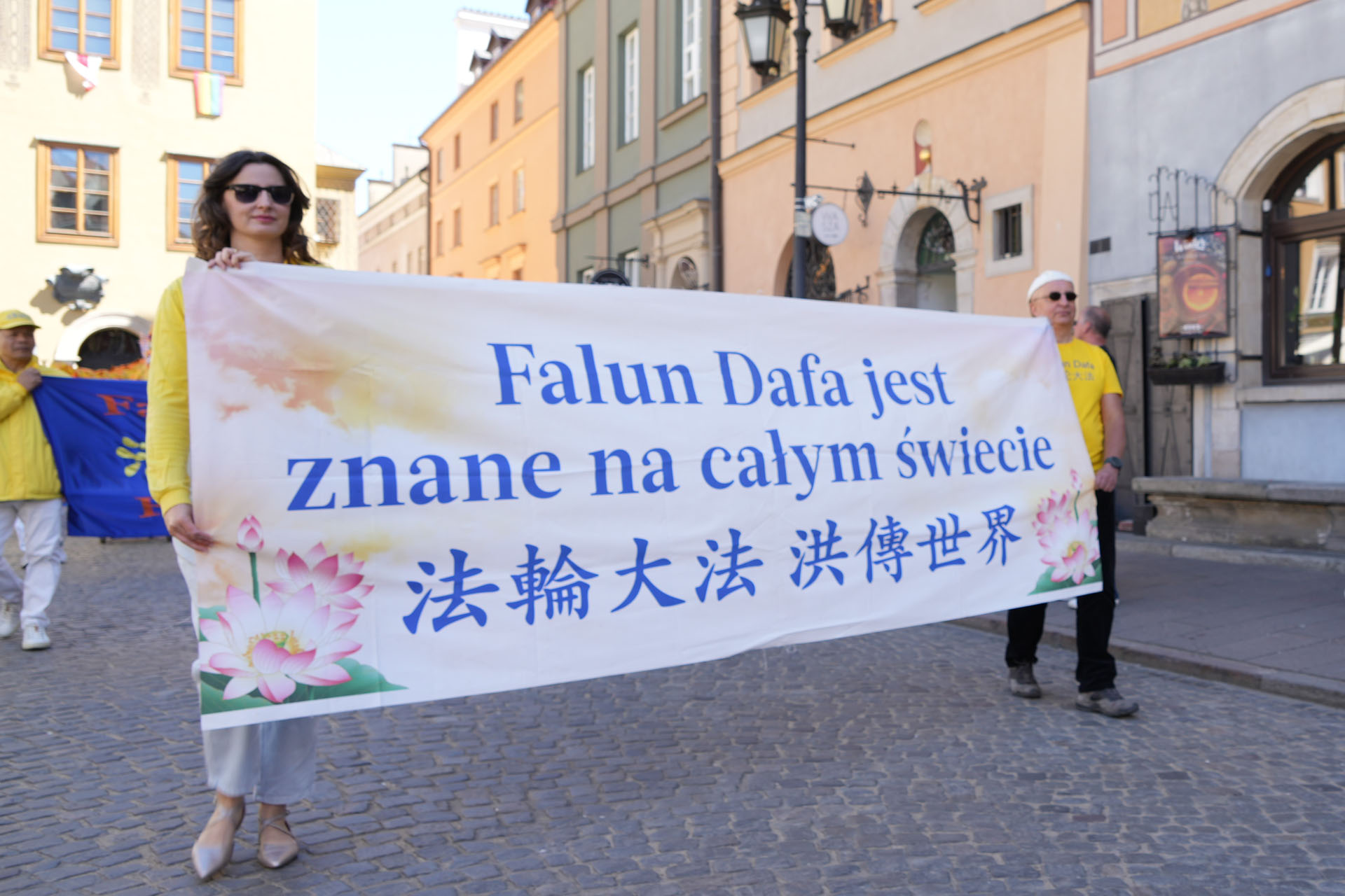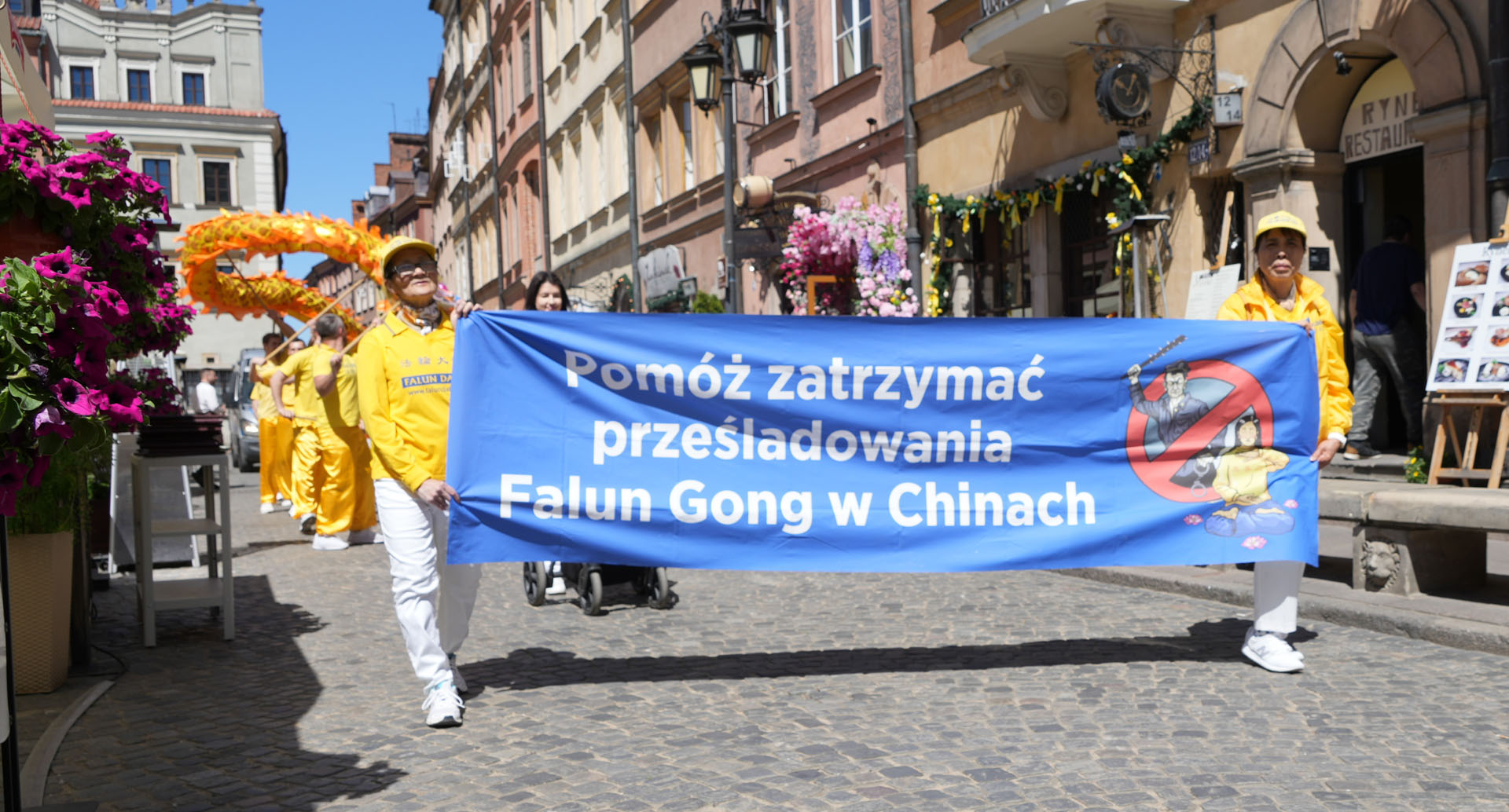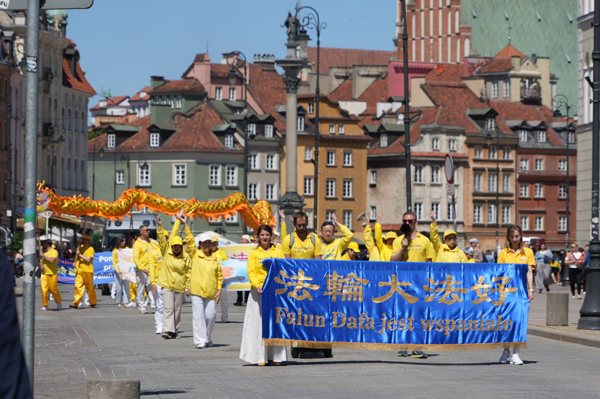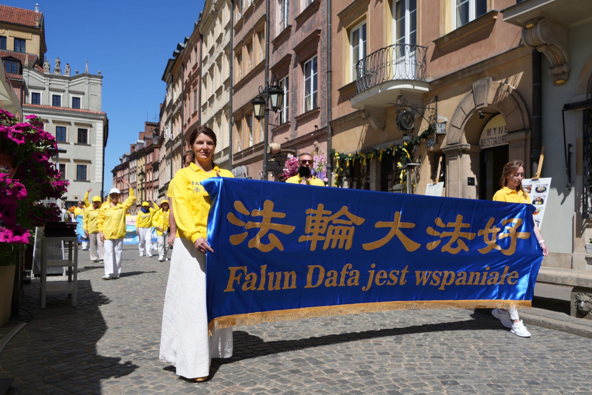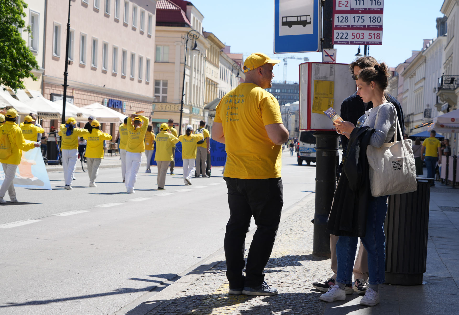 Praktikanti su u Poljskoj, 12. maja 2024., održali ktivnosti na Starom gradskom trgu u Varšavi kako bi proslavili 32. godišnjicu predstavljanja Falun Dafa javnost, koja je ujedno i Svjetski dan Falun Dafa.
