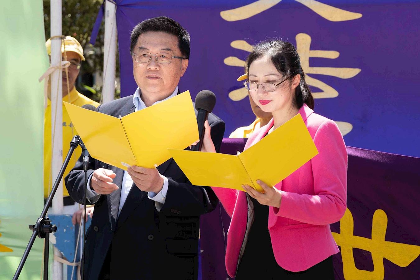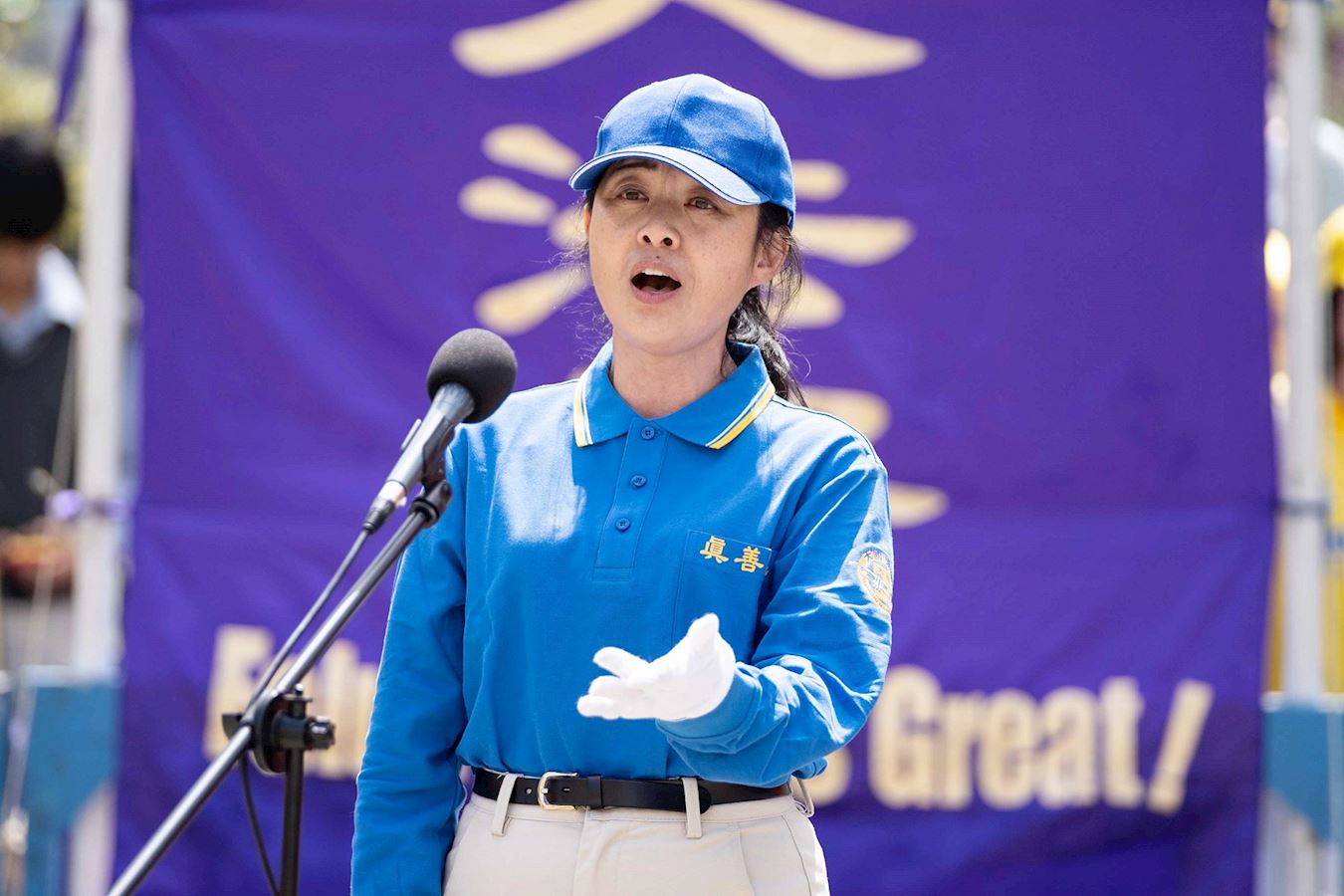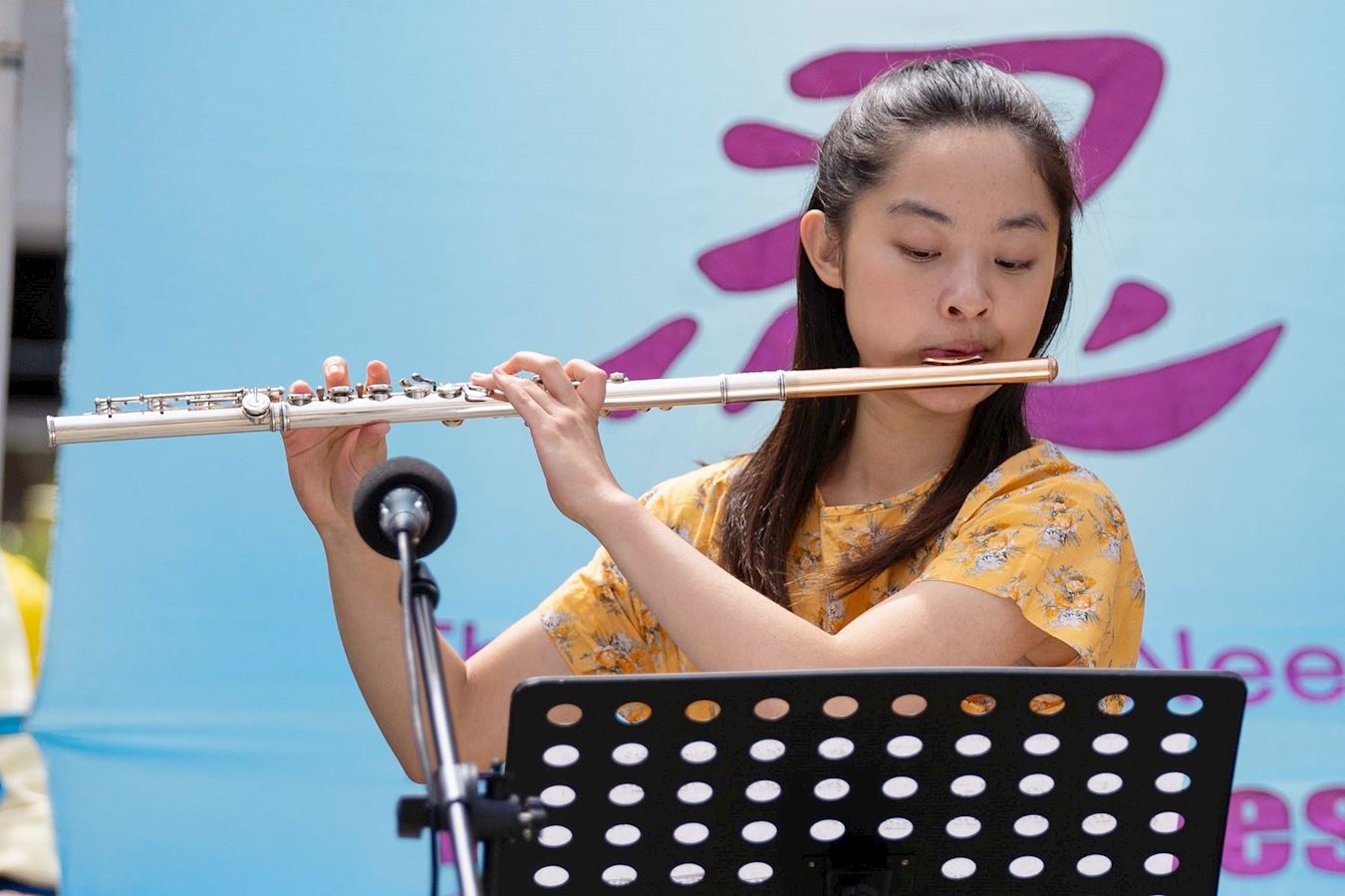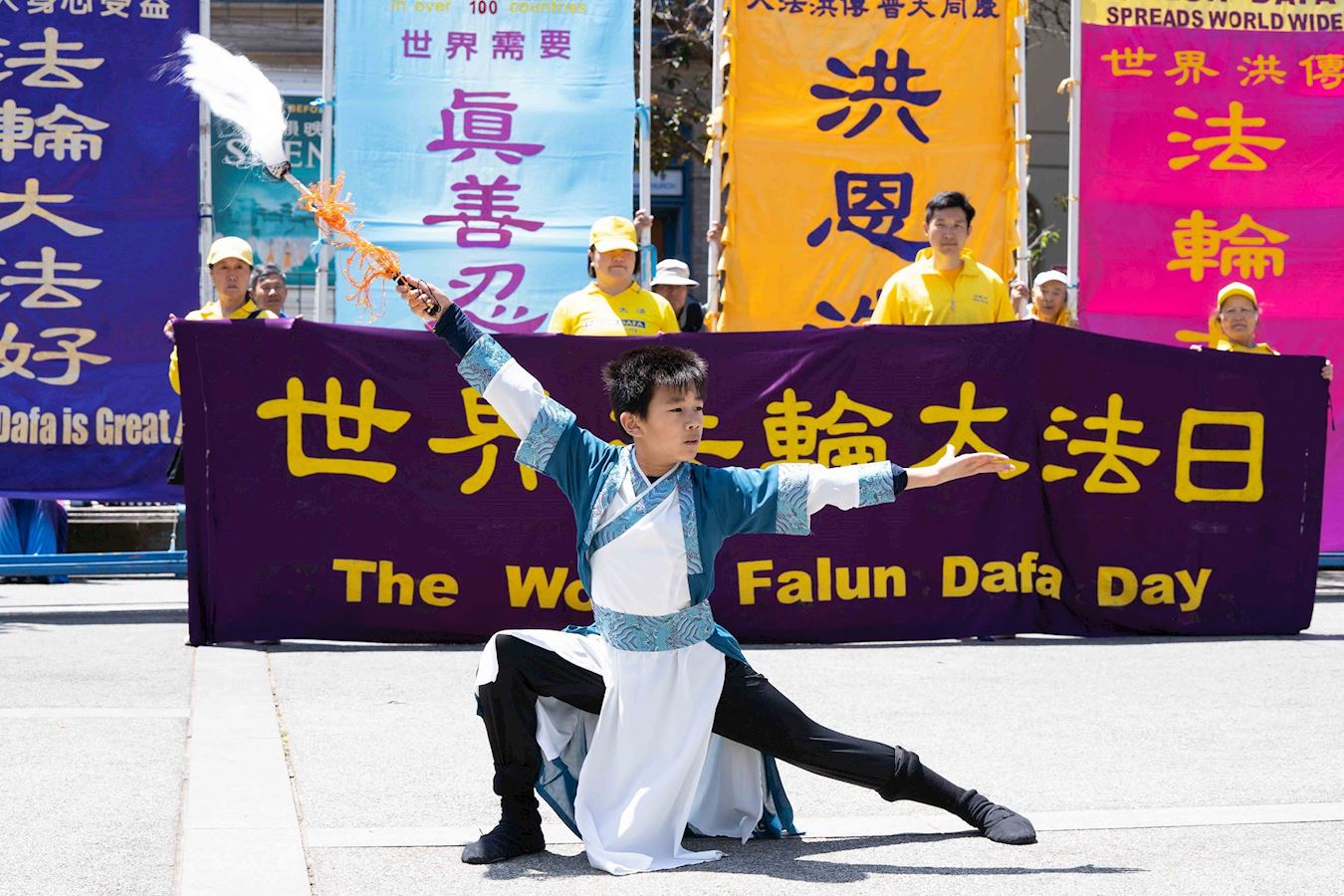 Američki West Tian Guo Marching Band je započeo manifestaciju izvođenjem nekoliko pjesama, nakon čega su praktikanti dijelili lična iskustva o pozitivnim promjenama u njihovom zdravlju i dobrobiti kroz prakticiranje Falun Dafa. Uslijedio je plesni komad “Taichi Učitelj”, recital poezije, solo recital kineskog muzičkog instrumenta pipa i nastupi dobošara.