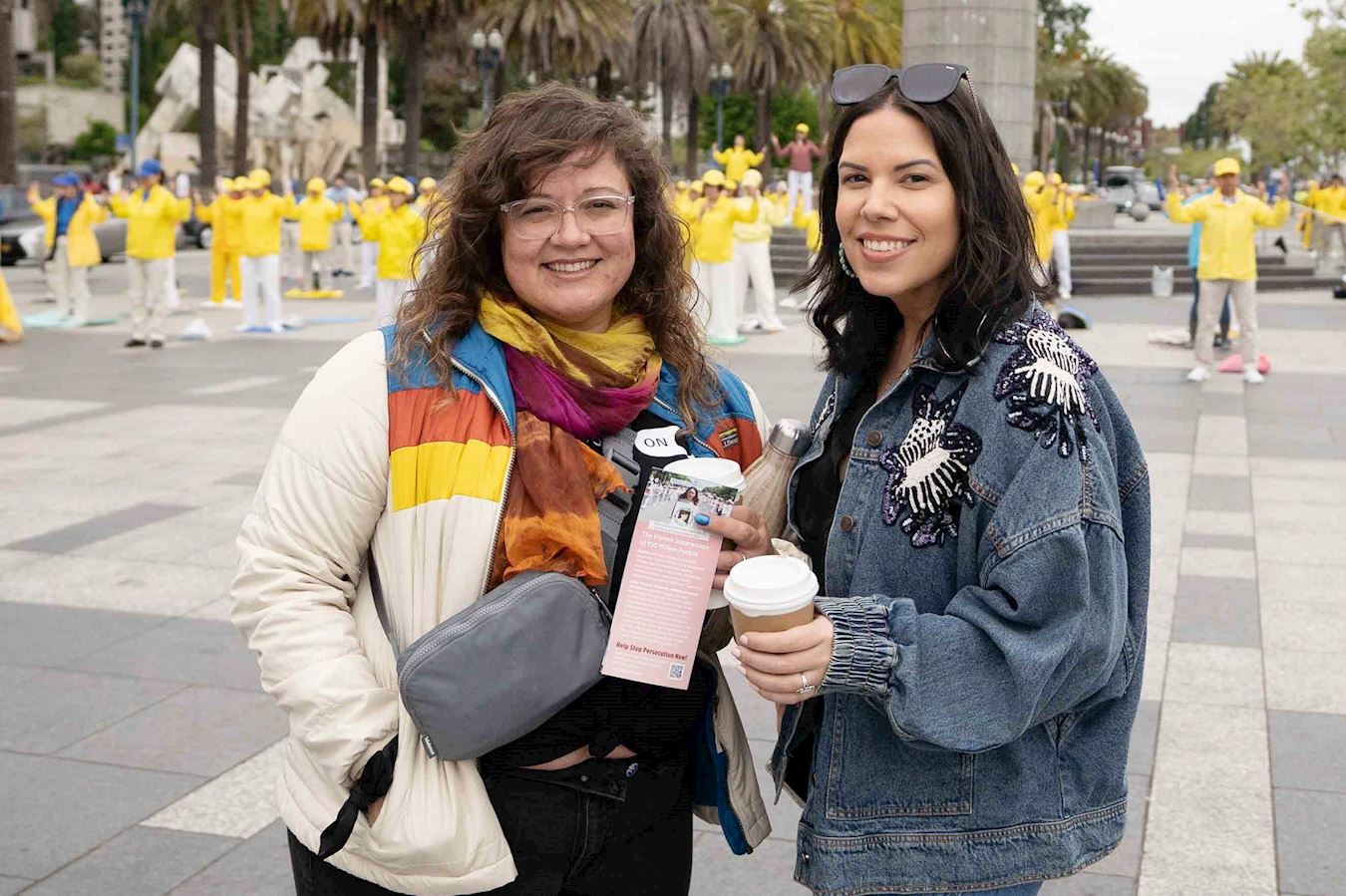 Laroul, stanovnica San Francisca, sa zadovoljstvom je prihvatila letak koji joj je uručio praktikant. Rekla je da je imala dojam da su praktikanti bili mirni dok su radili vježbe. Nekoliko minuta kasnije, vratila se i rekla: „Mogu li da sjednem zajedno sa ovim praktikantima?“ Zatim je sjela među praktikante koji su radili sjedeću meditaciju. Lice joj je bilo prekriveno suzama. Na pitanje zašto se vratila, rekla je da je pročitala letak i da je bila tužna kada je saznala za progon u Kini.