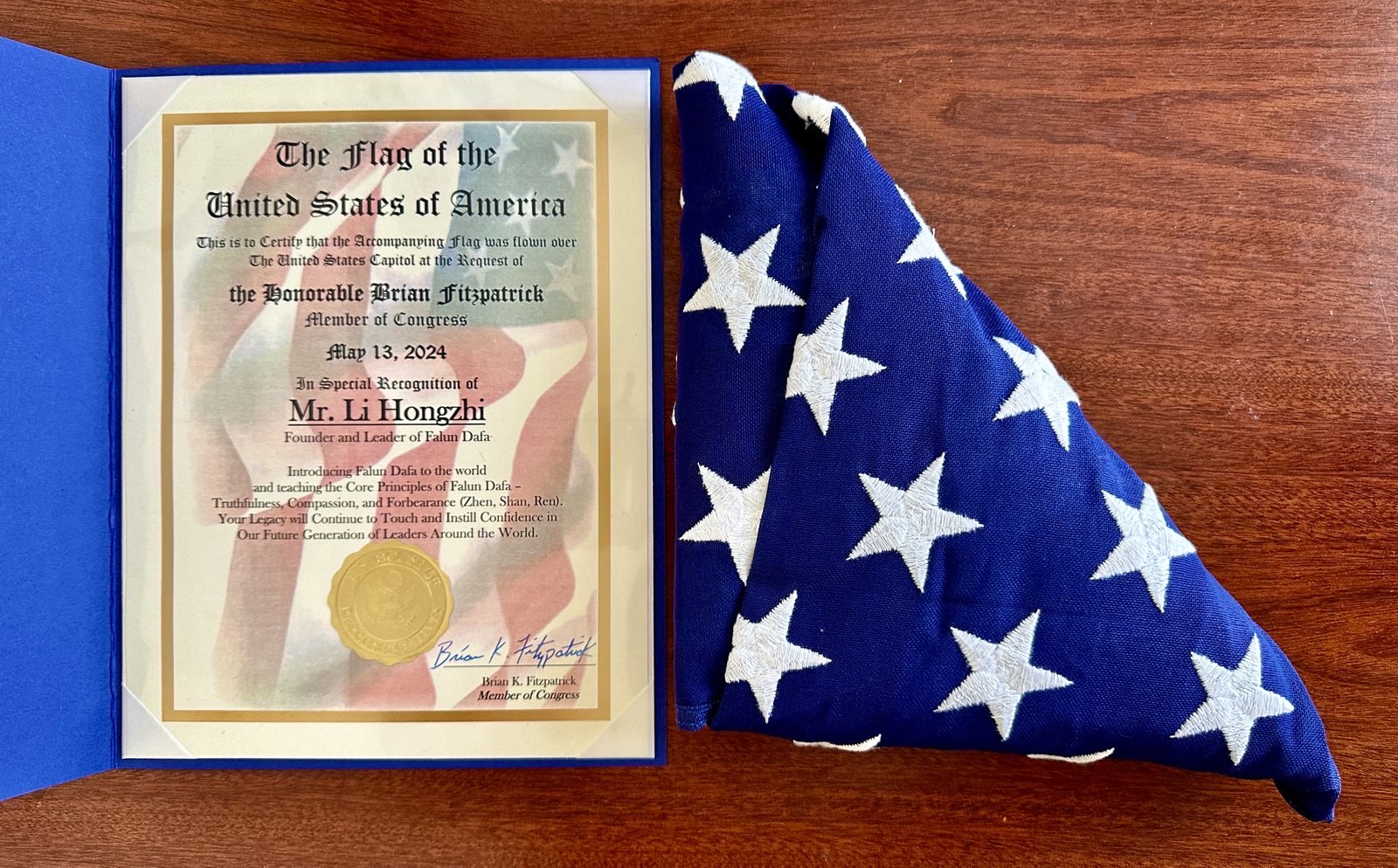 Kongresmen Brajan Ficpatrik, koji je sponzorisao ovaj događaj, napisao je da je zastava podignuta u znak posebnog priznanja gospodinu Liju za „uvođenje Falun Dafe u svetu i podučavanje osnovnim principima Falun Dafe – istinitosti, blagosti, trpeljivosti.