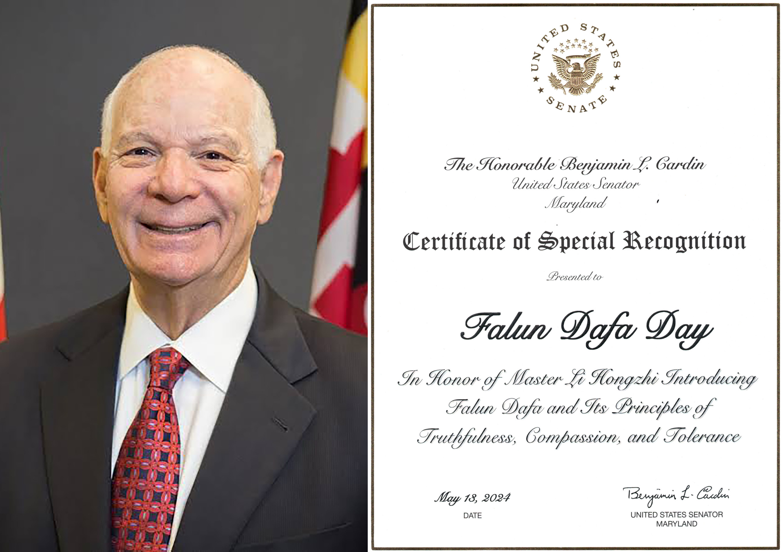 Senator Ben Kardin iz Merilenda objavio je Potvrdu o posebnom priznanju, „u čast majstoru Li Hongdžiju, koji je predstavio Falun Dafu i njene principe istinitosti, blagosti i trpeljivosti.“
