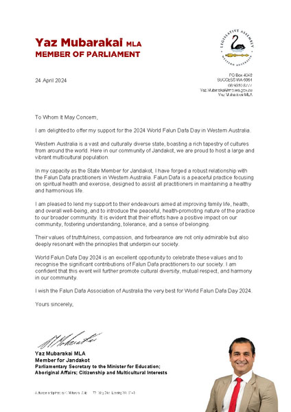 Pismo glasi: “Falun Dafa, sa svojim osnovnim principima Istinitosti, Dobrodušnosti i Tolerancije, nudi put ka poboljšanju zdravlja, vitalnosti i unutrašnjeg mira kroz meditaciju i vježbe. Inspirativno je vidjeti kako ove univerzalne vrijednosti odjekuju preko kulturnih i nacionalnih granica, promovišući mir i dobru volju među svim ljudima.”