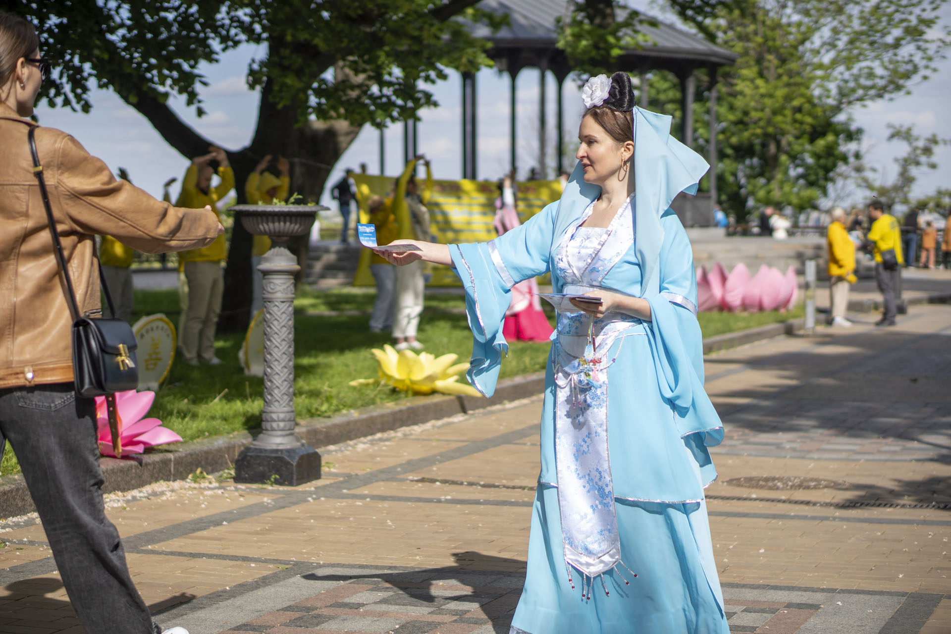 Odjevena u kostim nebeske djevojke, Zoryana je dijelila letke o Falun Dafa i objašnjavala šta je zapravo prakticiranje. Dobila je oduševljene odgovore. Neki ljudi su rekli da će otići na Falun Dafa web stranicu kako bi saznali više o Falun Dafa.