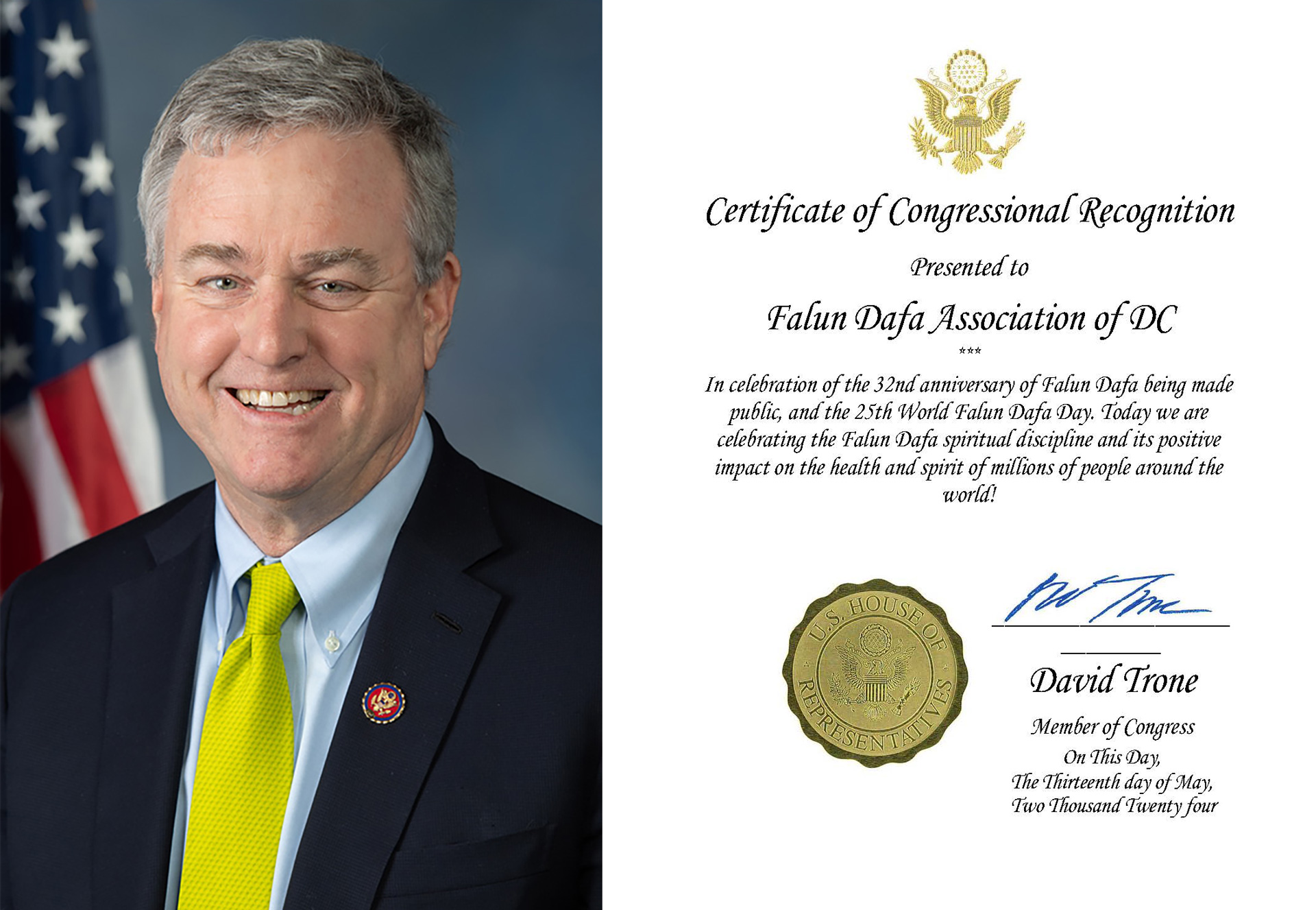 U potvrdi kongresmena Davida Tronea, koji zastupa 6. distrikt Marylanda, stoji: „U okviru proslave 32. godišnjice objavljivanja Falun Dafa i 25. Svjetskog dana Falun Dafa. Danas slavimo Falun Dafa duhovnu disciplinu i njen pozitivan uticaj na zdravlje i duh miliona ljudi širom svijeta!”