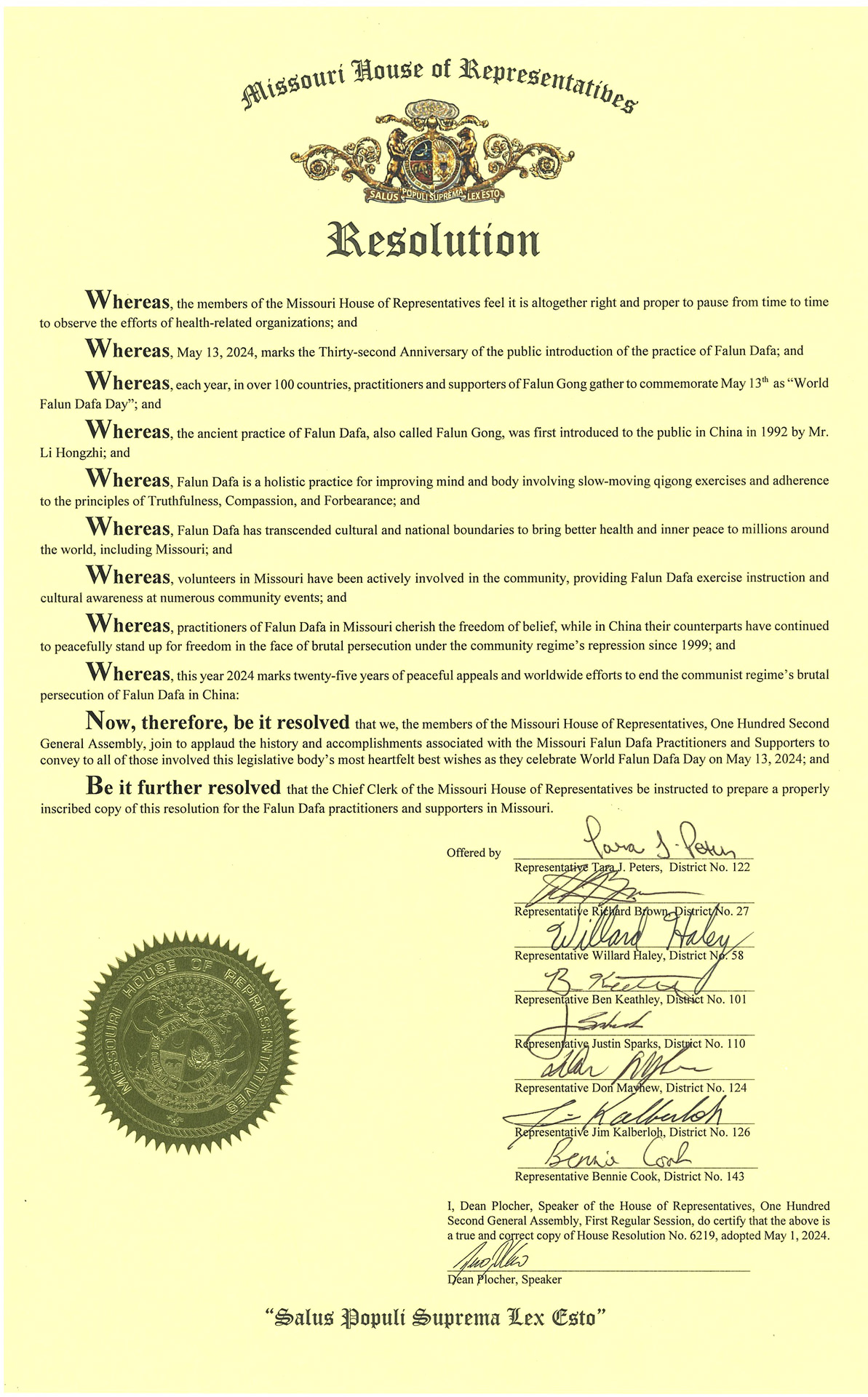 Predstavnički dom Missourija je 1. maja izdao Rezoluciju 6219 koja glasi: “Mi, članovi Predstavničkog doma Missourija, Sto druge generalne skupštine, pridružujemo se aplauzima istoriji i dostignućima povezanim sa praktikantima i pristalicama Falun Dafa iz Missourija da svima koji su uključeni prenesu najiskrenije želje ovog zakonodavnog tijela.”