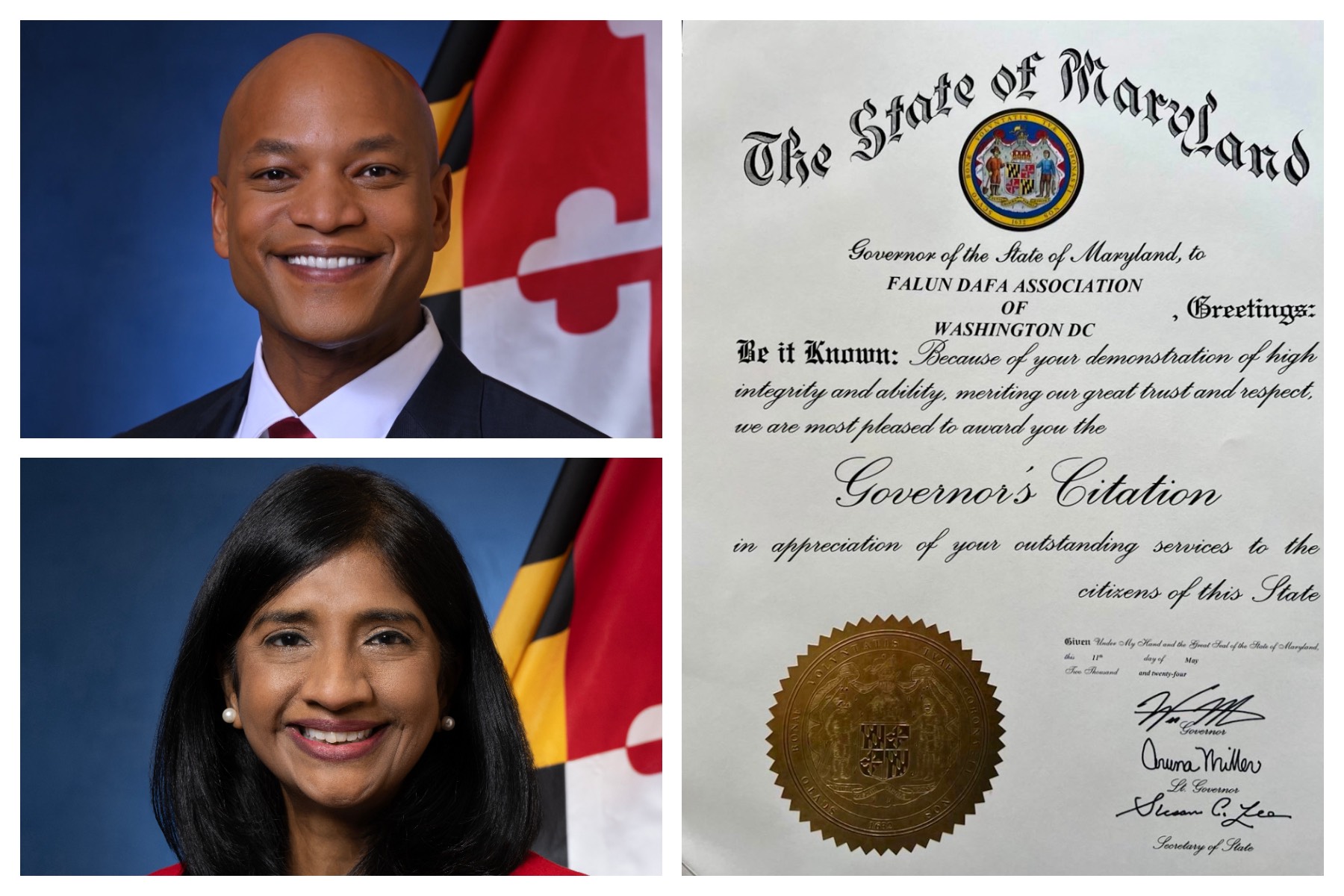 Wes Moore, guverner države Maryland, je objavio citat Falun Dafa udruženju Washington DC. Citat glasi: „Neka se zna: Zbog vaše demonstracije visokog integriteta i sposobnosti, što zaslužuje naše veliko povjerenje i poštovanje, sa velikim zadovoljstvom vam dodijelimo Guvernerovu nagradu, u znak zahvalnosti za vaše izvanredno služenje građanima ove države. ”