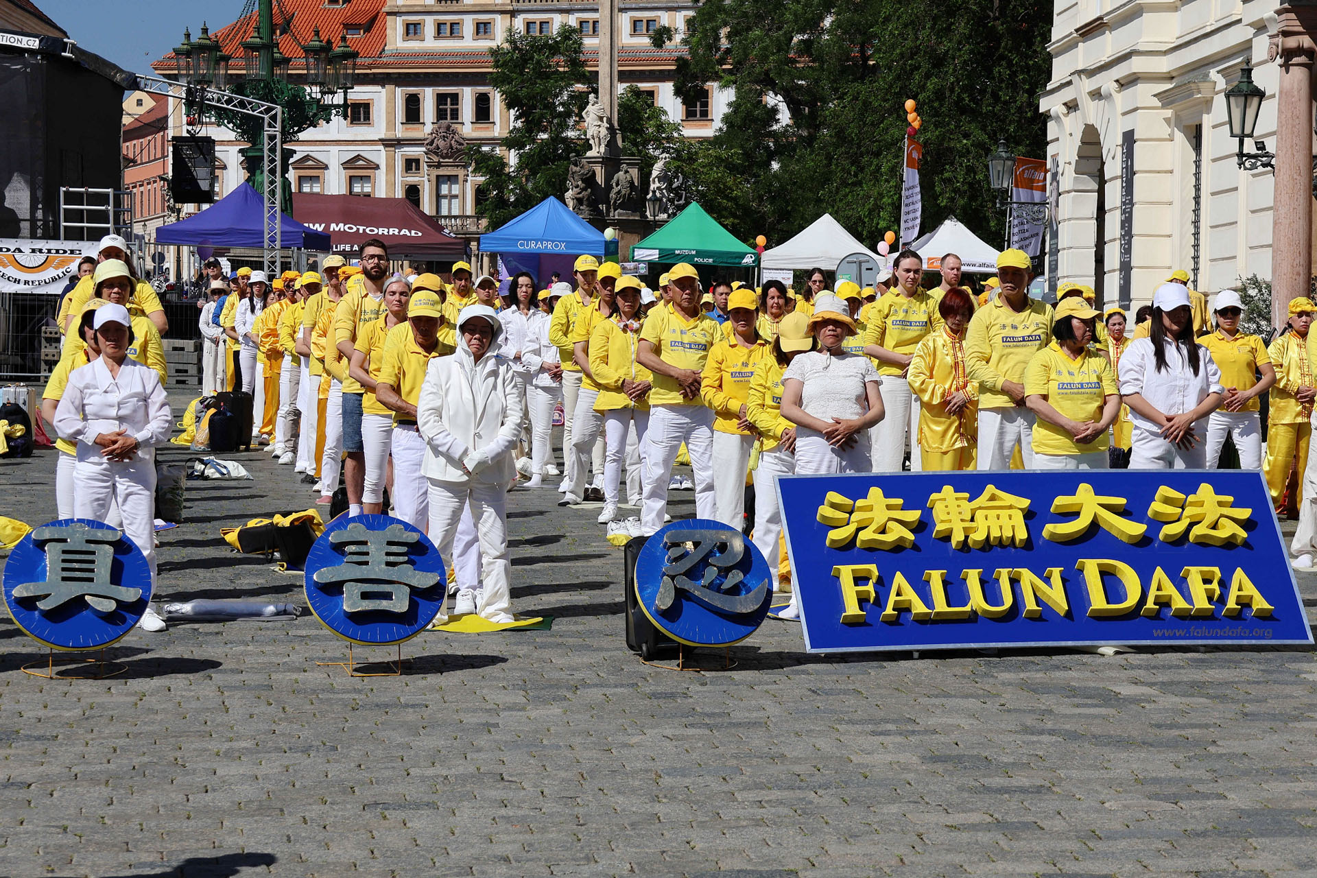 Sunčanog 8. juna, brojni turisti su se okupili na Hradčanskom trgu kako bi posjetili Praški dvorac i gledali smjenu straže. Za razliku od gužve u Zamku, grupa Falun Dafa praktikanata obučenih u žute košulje tiho je na uglu trga meditirala uz umirujuću muziku.
