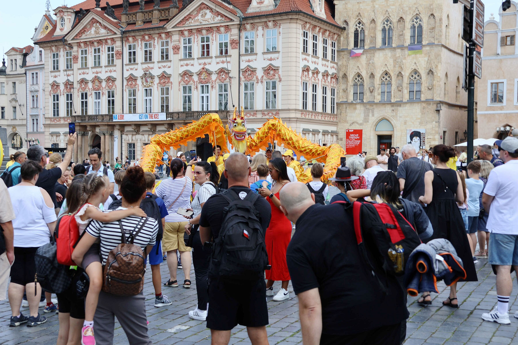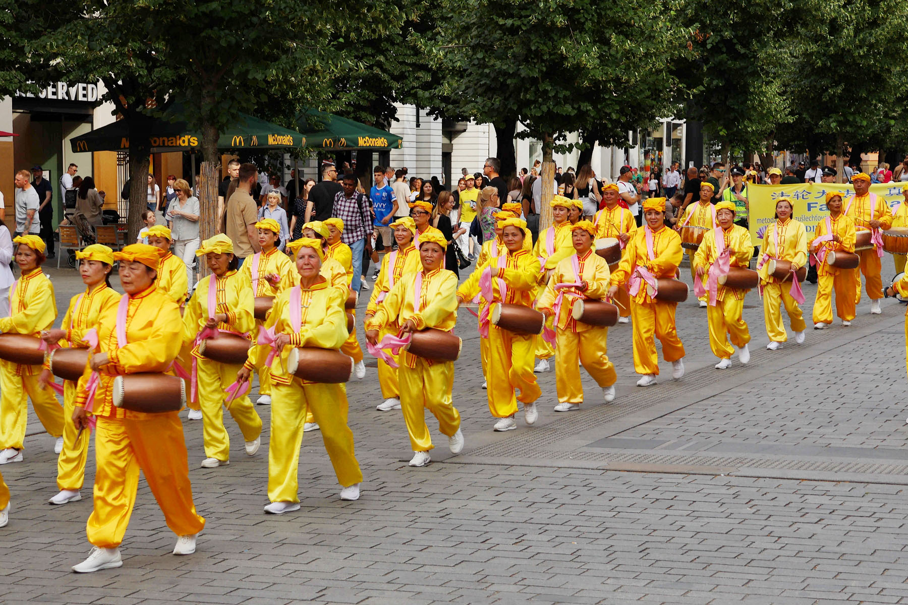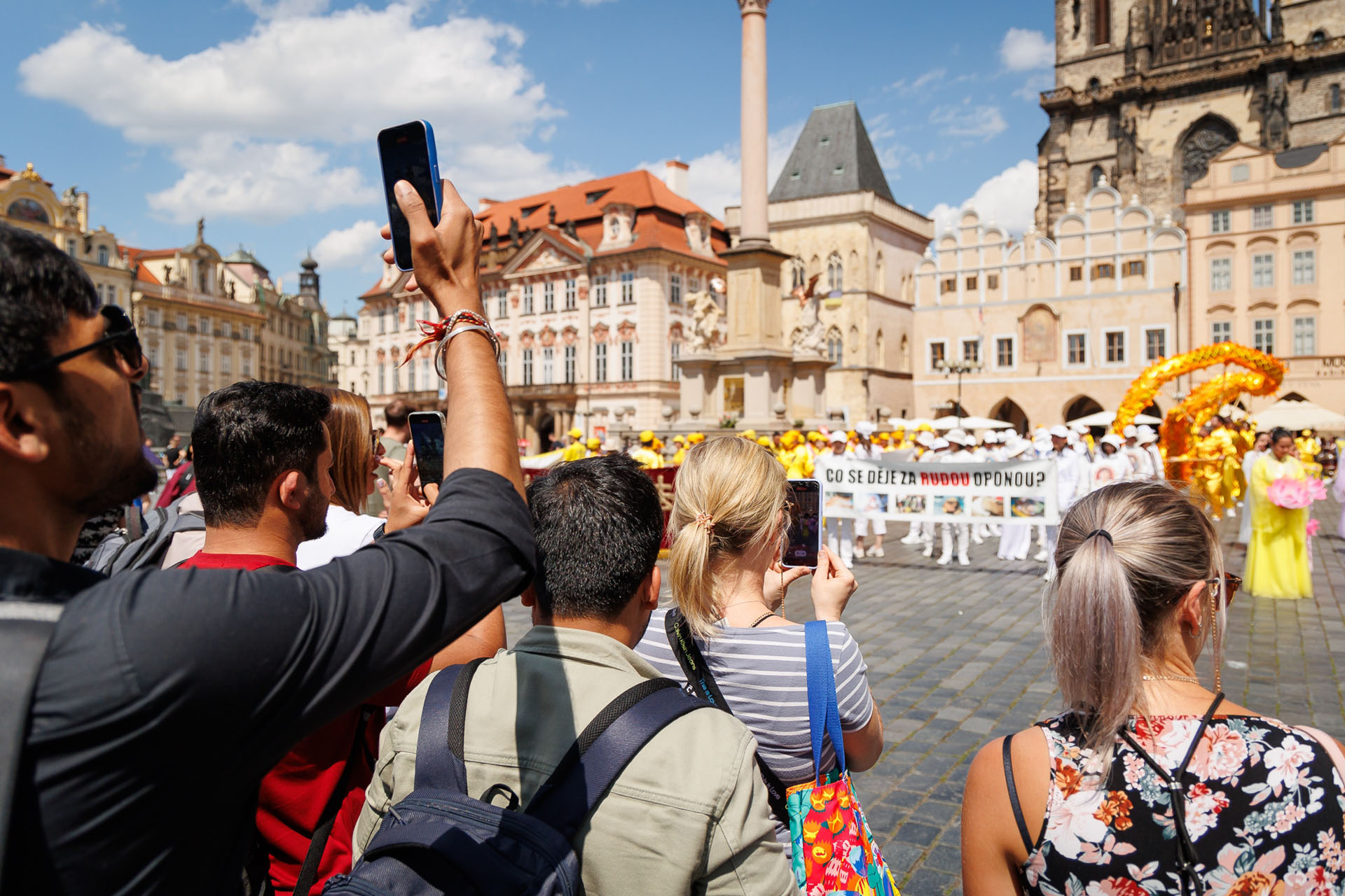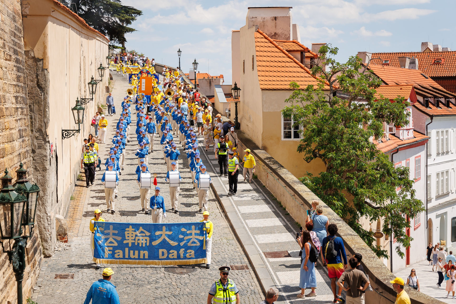 Parada je krenula sa Hradčanskog trga, prešla Karlov most i na kraju stigla do Starog gradskog trga gdje su praktikanti izveli razne izvedbe. Mnogi turisti su se fotografisali sa muzičarima Tian Guo Marching Banda, modelom knjige Zhuan Falun i transparentima sa zlatnim kineskim slovima za “Istinitost, Dobrodušnost i Toleranciju.”