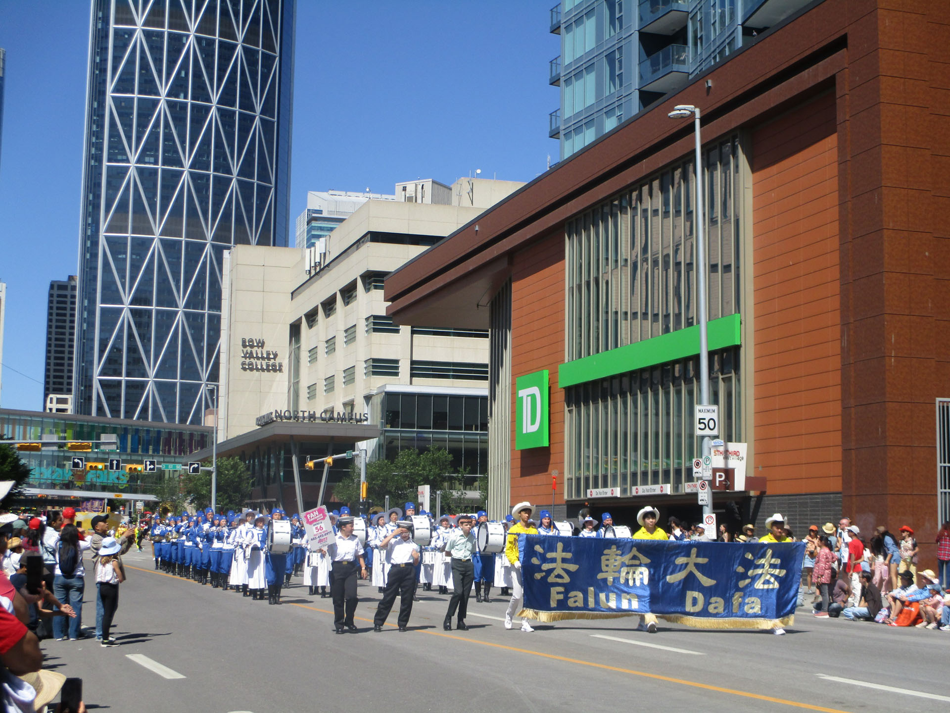 Falun Dafa tim, koji je predstavljao tradicionalnu kinesku kulturu, sastojao se od tri dijela: orkestar Tian Guo Marching Band, velika zlatna maketa broda i tim bubnjara. Članovi benda nosili su plavo-bijele kostime, obnavljajući drevni stil dinastije Tang. Brod je bio ukrašen ružičastim lotosima u punom cvatu i ljubičastim zastavicama s riječima “Istinitost, Dobrodušnost, Strpljivost.” Na brodu su praktikantice obučene poput vila sjedile u meditaciji, a druge su izvodile vježbe stojeći. Tim bubnjara u žutoj odjeći i ružičastim pojasevima marširao je uz glazbu.