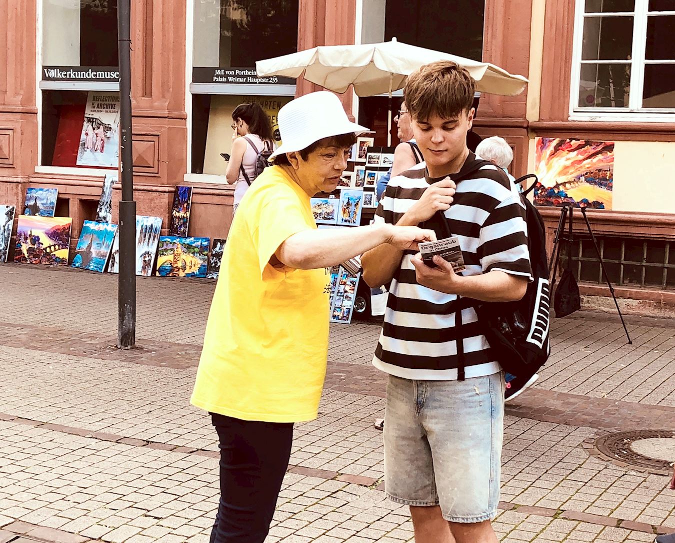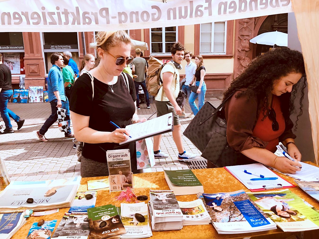 Kako bi obilježili 25. godišnjicu napora praktikanata Falun Gonga da okončaju progon u Kini, praktikanti iz njemačke metropolitanske regije Rhine-Neckar održali su aktivnosti za podizanje svijesti na popularnoj ulici Hauptstrasse u Heidelbergu 13. srpnja 2024. Oni su demonstrirali vježbe, prikupljali potpise, dijelili informacije o Falun Gongu i pozivali na prekid progona od strane Komunističke partije Kine (KPK).