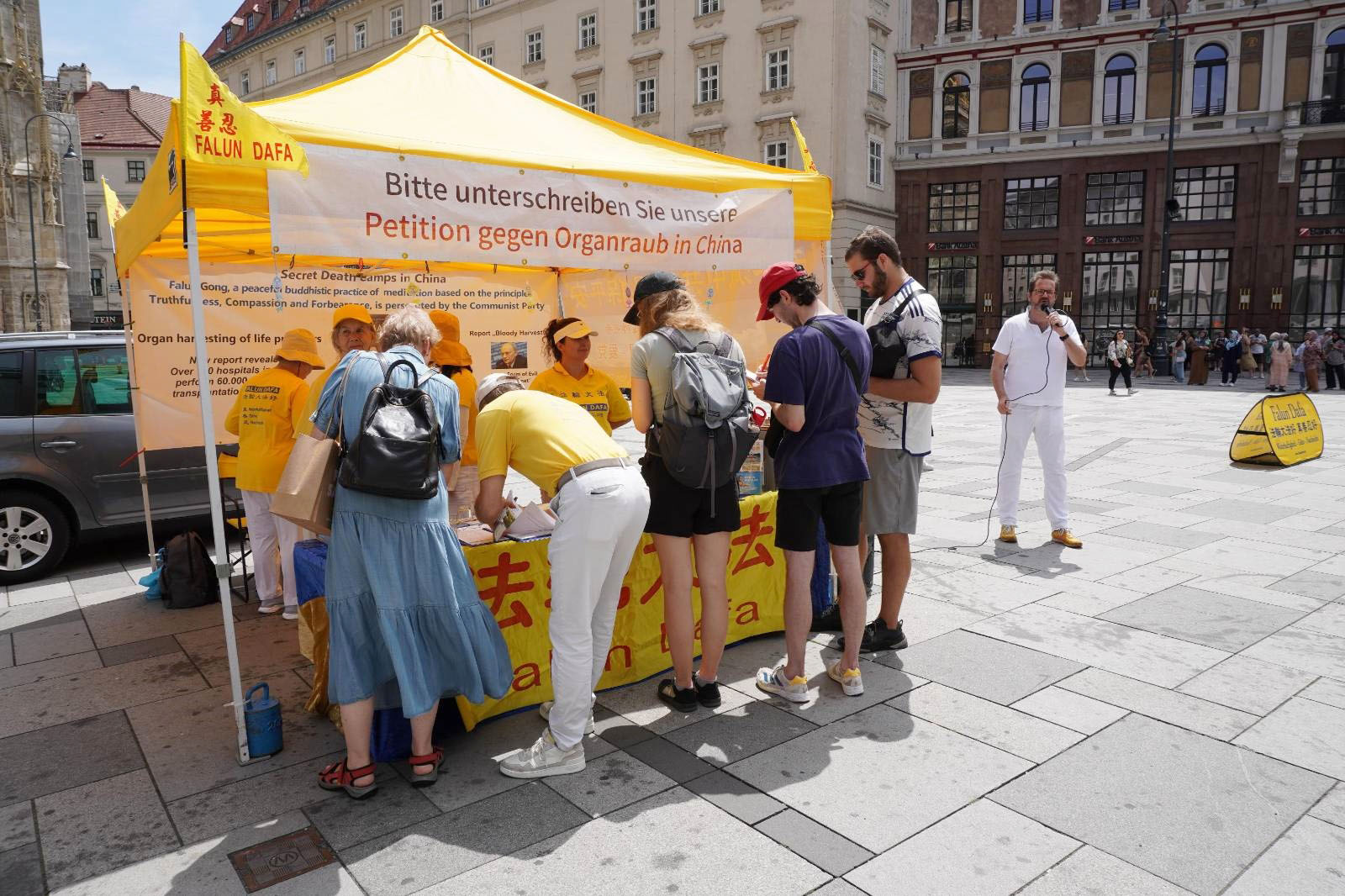 Štefansplac je tog jutra bio prepun. Mnogi ljudi su prišli informativnom pulti i nakon razgovora sa praktikantima potpisali peticiju kojom se poziva na prekid progona i zaustavljanje živog uzimanja organa koje sprovodi KPK.