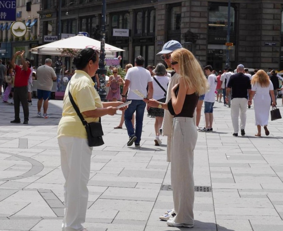 Obeležavajući 25. godišnjicu nastojanja Falun Gong praktikanata da okončaju progon od strane Komunističke partije Kine (KPK), praktikanti su 13. jula 2024. održali miting na Štefansplacu u Beču. Oni su demonstrirali vežbe i postavili su info panoe o 25-godišnjem progonu.