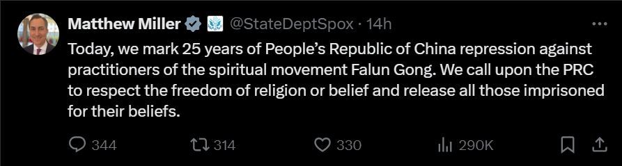 Istog dana, Matthew Miller, glasnogovornik Ministarstva vanjskih poslova SAD-a objavio je na X: “Danas obilježavamo 25 godina represije Narodne Republike Kine protiv praktikanata duhovnog pokreta Falun Gong. Pozivamo NR Kinu da poštuje slobodu vjere ili uvjerenja i oslobodi sve one koji su zatvoreni zbog svojih uvjerenja.”