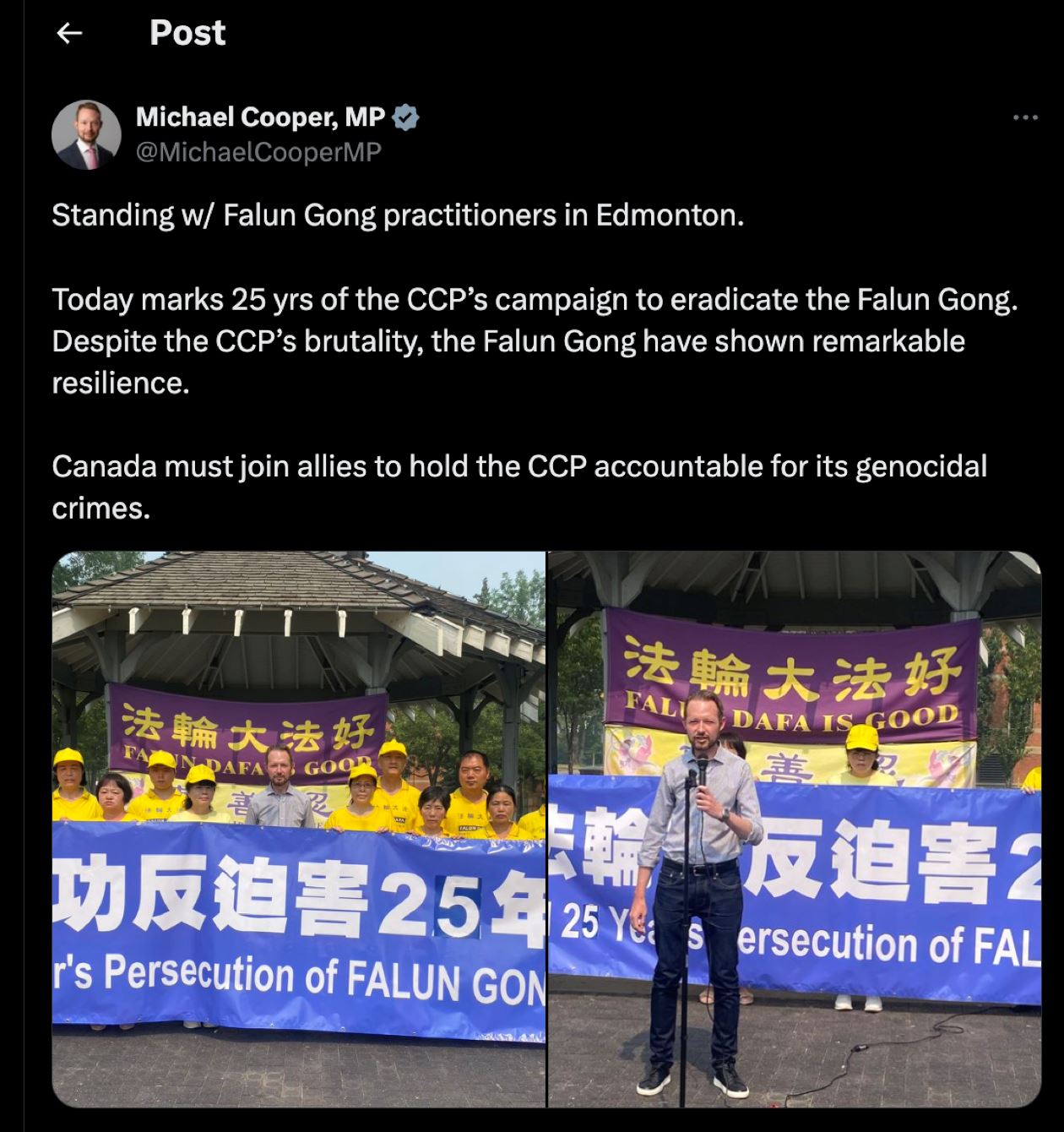 Kanadski član parlamenta Michael Cooper rekao je na skupu u Edmontonu 20. srpnja ove godine: “Ne možemo sada spustiti oprez ili šutjeti pred progonom. Moramo glasno govoriti, razotkriti ova brutalna djela, praktikanti Falun Gonga su postali meta ugnjetavanja zbog podupiranja Istinitosti, Dobrodušnosti i Tolerancije, ali takvi principi su u potpunosti protiv zle pekinške totalitarne vlade.”