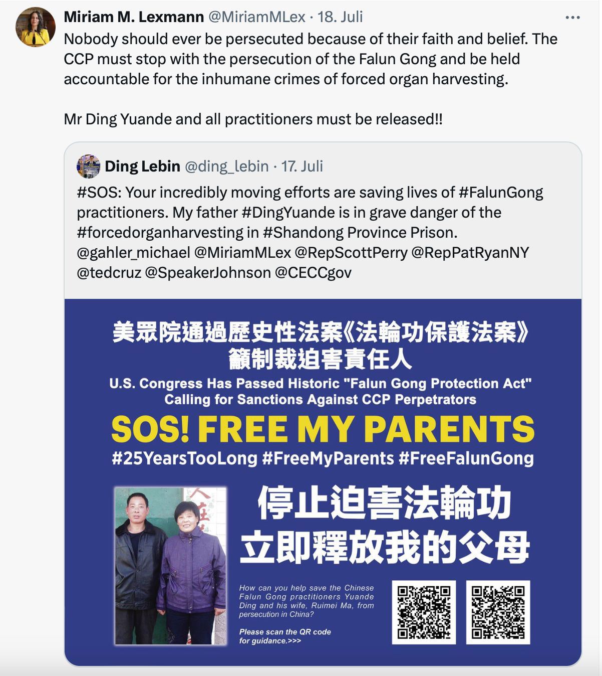 Miriam Lexmann, zastupnica u Europskom parlamentu (MEP), objavila je poruke na društvenim mrežama, oštro osuđujući prisilno vađenje organa od strane KPK i zahtijevajući od Partije da odmah oslobodi sve nezakonito pritvorene praktikante Falun Gonga.