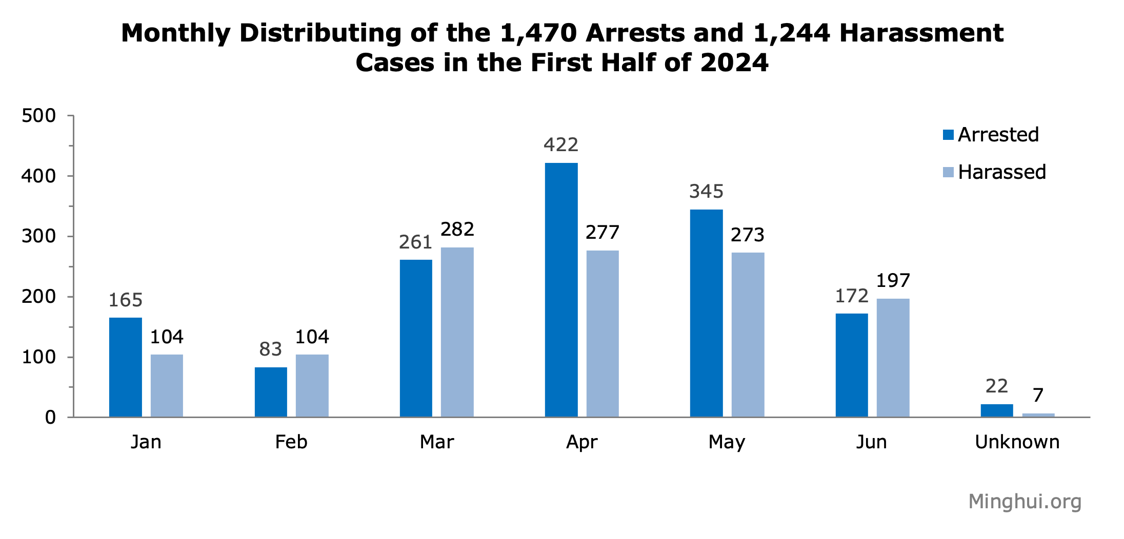 Prema informacijama koje je prikupio Minghui.org, ukupno 2,714 Falun Gong praktikanata je uhićeno ili maltretirano zbog svoje vjere u prvoj polovici 2024.