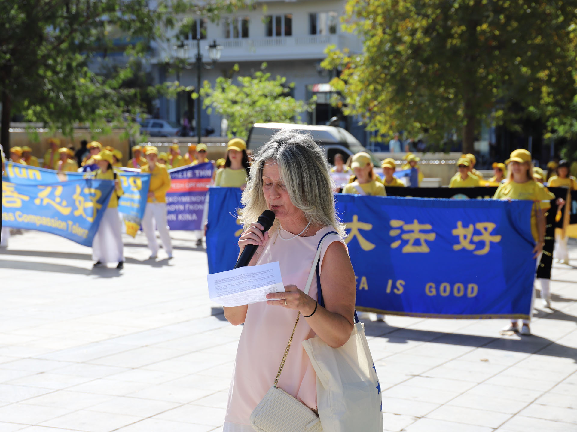 Kathrine je gledala Falun Gong marš na trgu Syntagma. Praktikant joj je objasnio principe Falun Gonga i postojanje progona KPK u Kini. „Mislim da su [Istinitost, Dobrodušnost i Tolerancija] temelj čovječanstva“, rekla je Kathrine. „Ako želimo da uživamo u životu, moramo ovo da uradimo. Ovo je osnovno i svako mora imati [vrijednosti].
