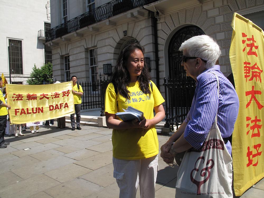 Deseci praktikantica, sve odjevene u bijelo, stajale su preko puta kineske ambasade i nosile fotografije praktikanata koji su umrli u pritvoru zbog svojih uvjerenja. Pokraj njih, praktikanti su držali transparente koji su poticali “Zaustavite progon u Kini” i “Raspustite Komunističku Partiju Kine”, na engleskom i kineskom jeziku.