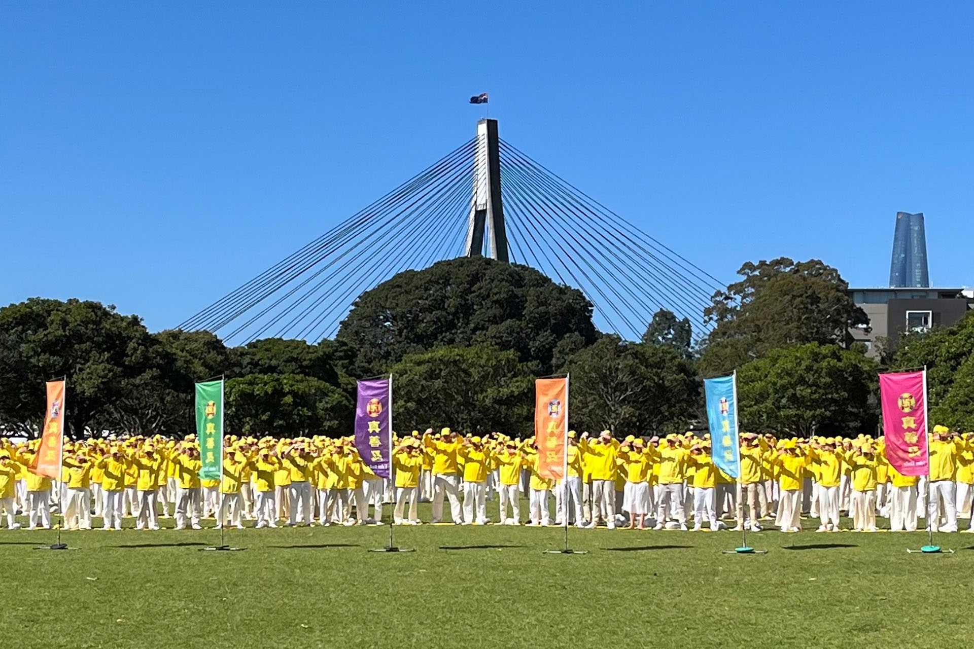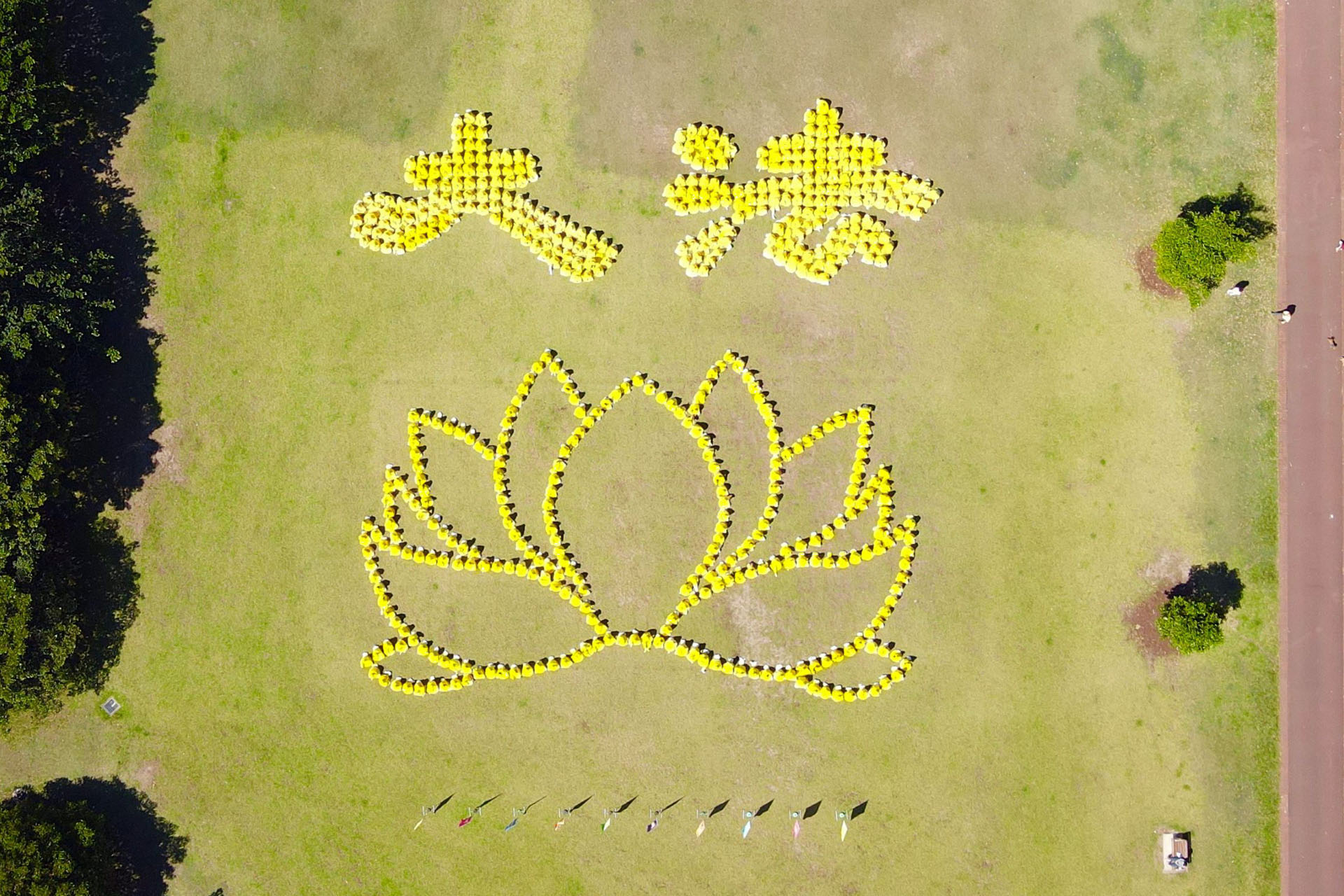 Falun Dafa praktikanti u Sydneyu okupili su se u Jubilee Parku 26. listopada 2024. za grupne vježbe i veliko formiranje znakova. Zajedno s praktikantima iz drugih dijelova Australije, oblikovali su kineske znakove za Da Fa (Veliki Zakon) kao i veliki lotosov cvijet koji je simbolizira proces usavršavanja prirode srca i uma kroz praksu kultiviranja. Žuti znakovi i cvijet izgledali su spektakularno na zelenoj pozadini parka.