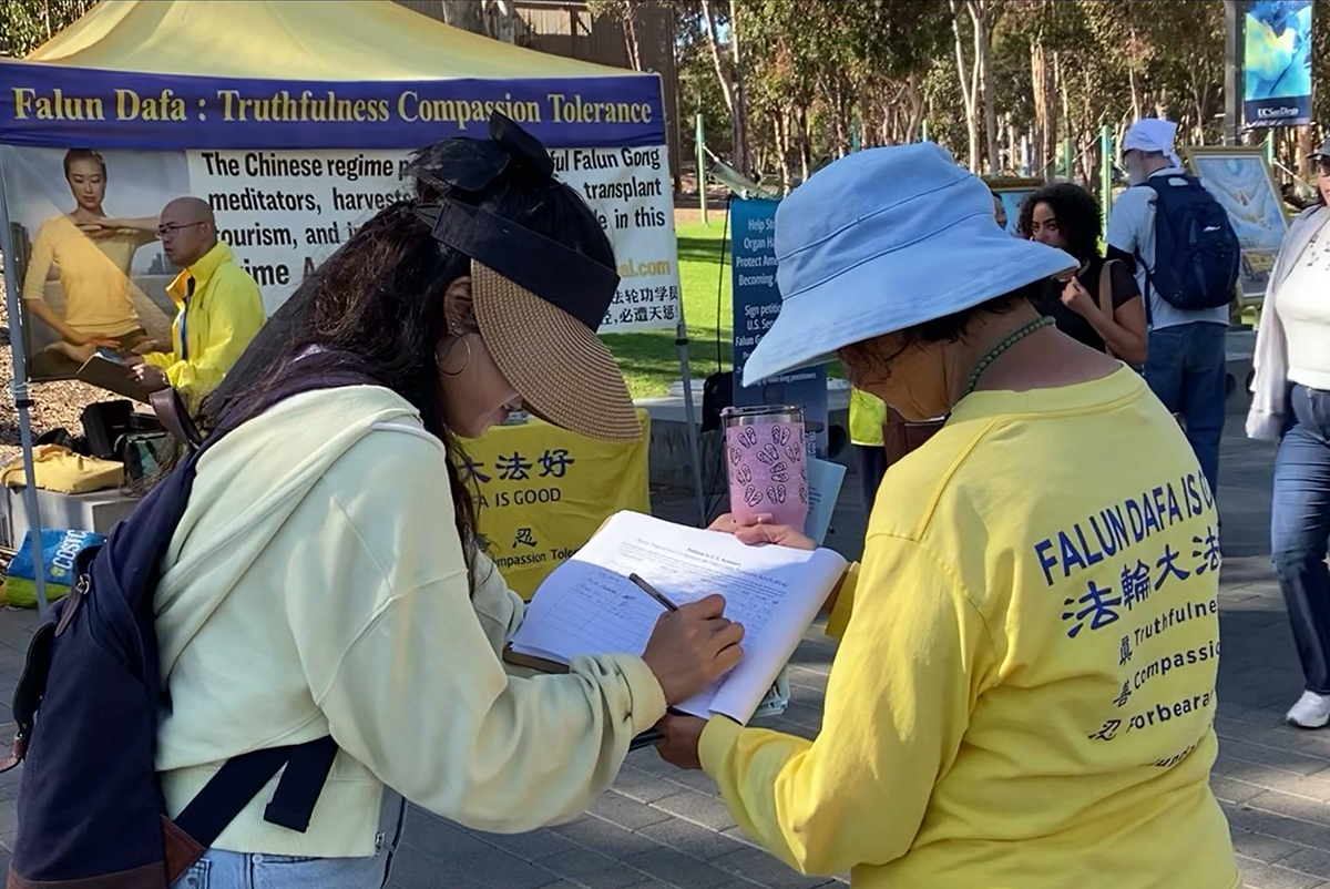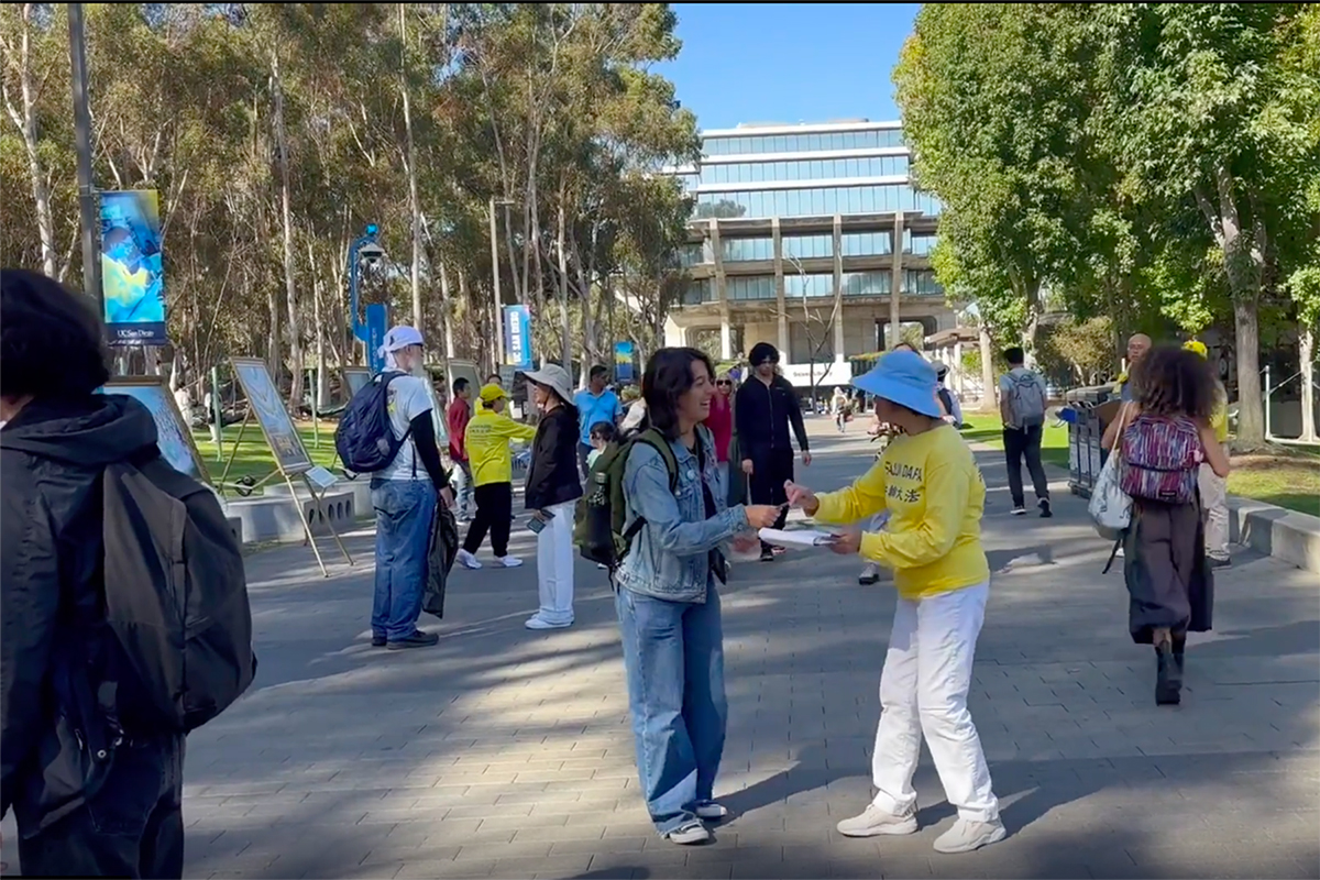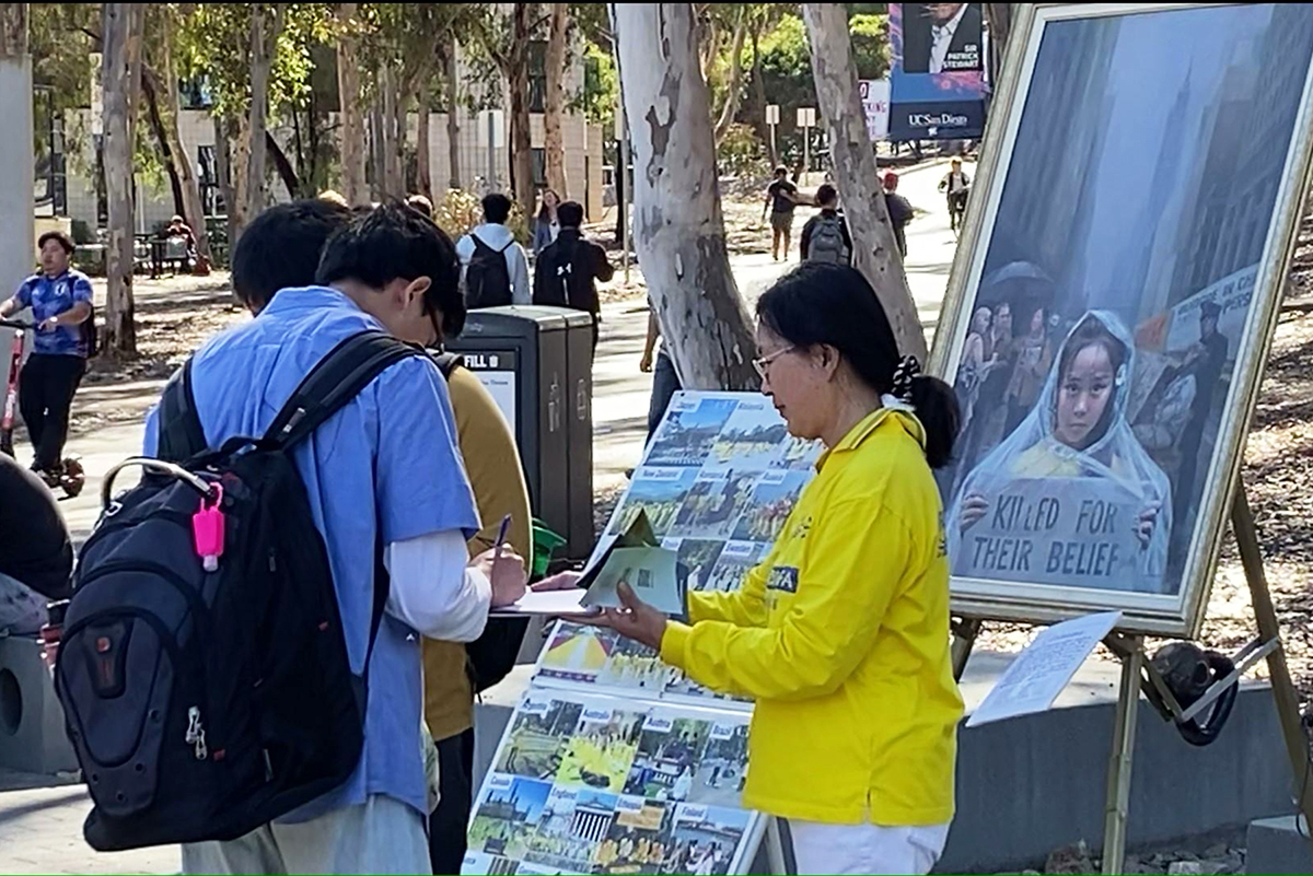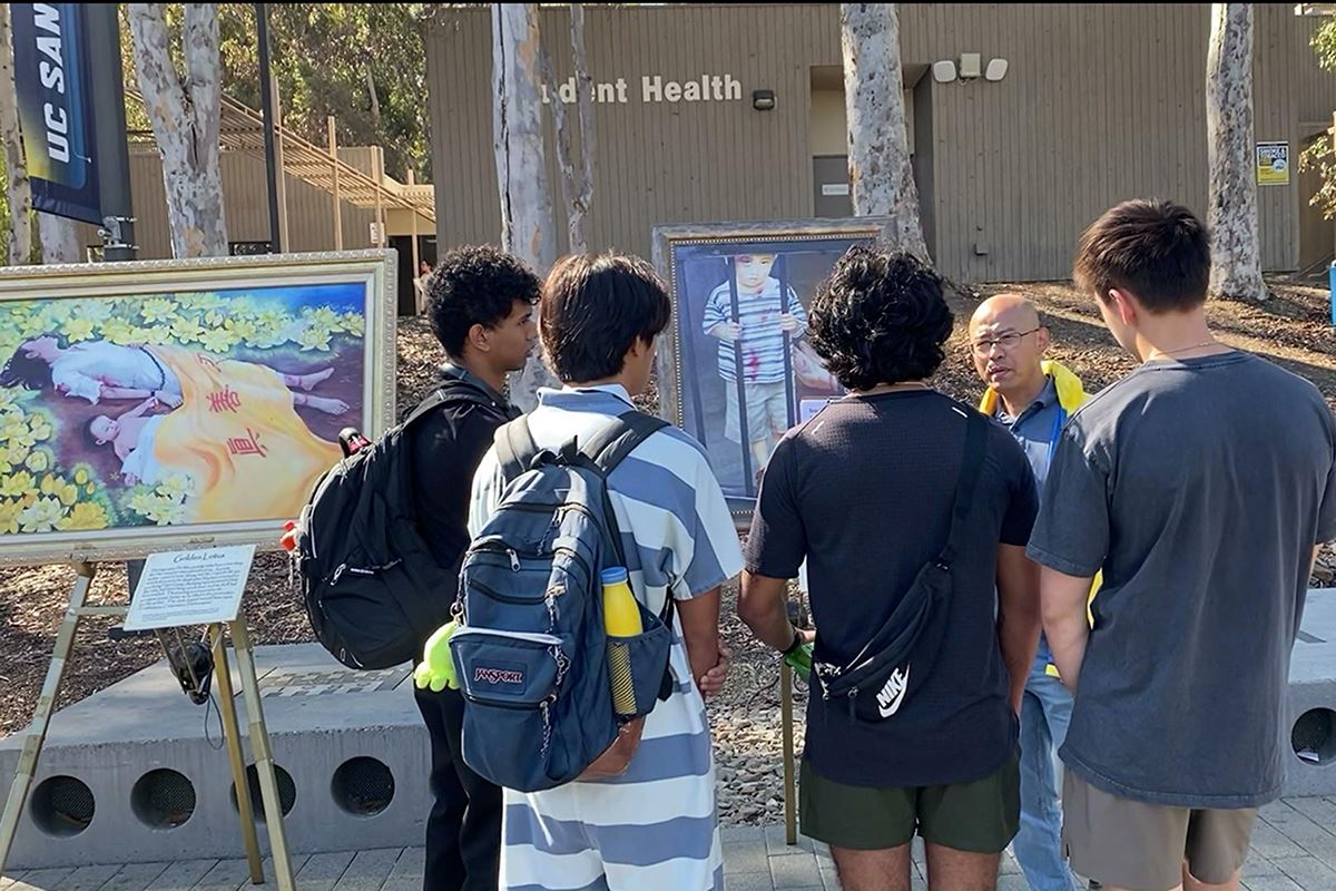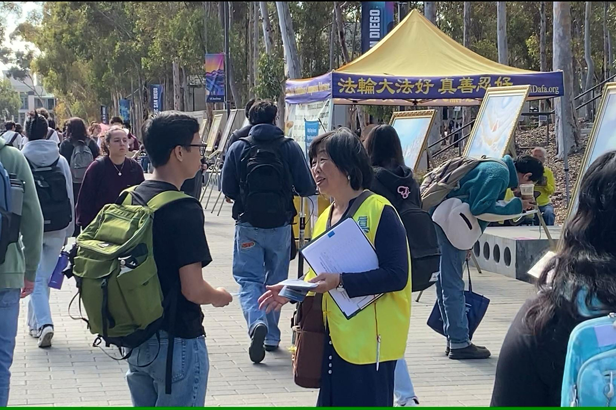 U kampusu Kalifornijskog sveučilišta u San Diegu (UCSD), slike s međunarodne izložbe Umjetnost Zhen Shan Ren (Istinitost, Dobrodušnost, Strpljenje) bile su poredane duž ceste koja vodi do knjižnice dana 14. listopada 2024., dajući studentima koji su prolazili prilike da nauče o Falun Dafa i progonu kojeg u Kini provodi Komunistička partija Kine (KPK). Događaj je također uključivao prikupljanje potpisa za S.4914 Senata SAD - Zakon o zaštiti Falun Gonga.