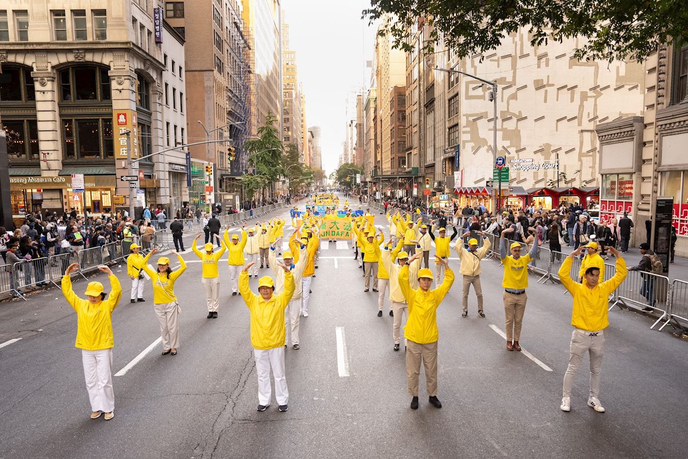 Kao najveća kineska grupa, Falun Dafa praktikanti učestvovali su u paradi već 20. godinu zaredom marširajući na njenom začelju. Doveli su Tian Guo Marching Band, i demonstrirali Falun Dafa vježbe, zajedno sa barjaktarskom grupom, pokretnim splavom, plesom lotosa, dobošarskom grupom i LED vozilom. Impresioniran prezentacijom, širenjem pozitivne energije i transparentima s tradicionalnim vrijednostima na „Najpatriotskoj milji Amerike“, jedan gledalac je rekao: „Ovaj svijet će postati bolje mjesto ako više ljudi bude prakticiralo Falun Dafa.“