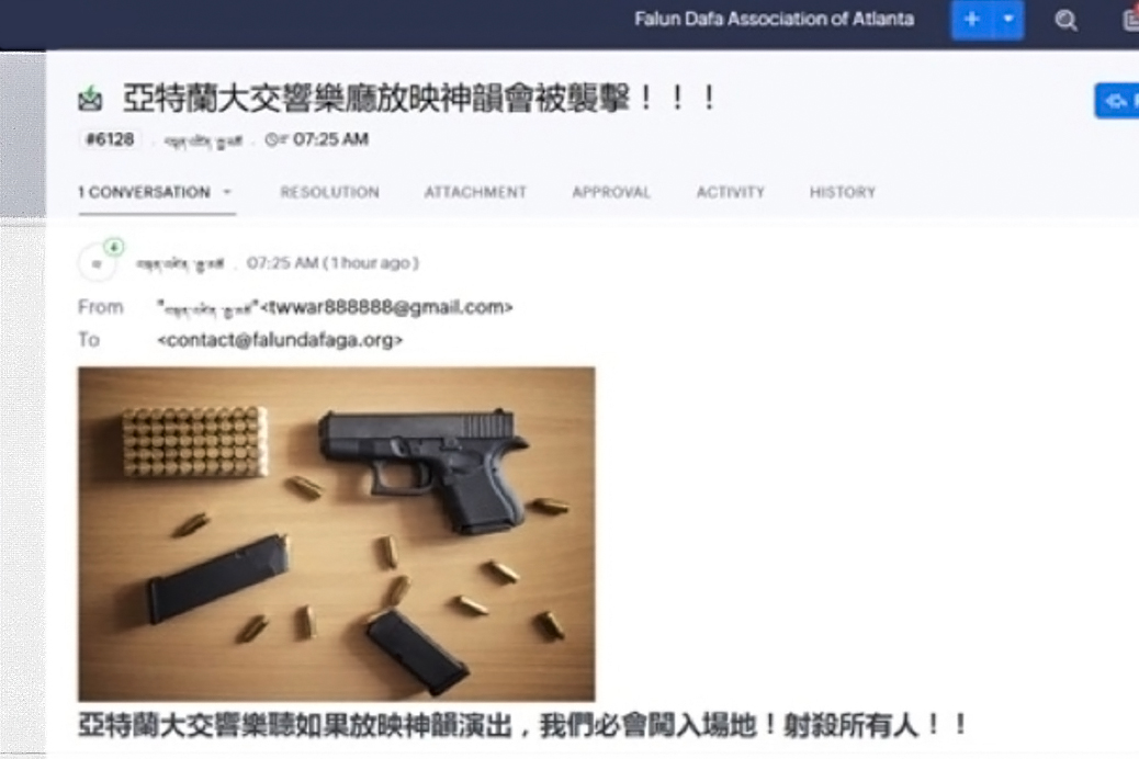 E-mail je poslan u 7:25 ujutro i naslovljen: "Pucnjava će se dogoditi kada Shen Yun bude nastupao u simfonijskoj dvorani Atlante." U e-mailu je stajalo: "Ako Atlanta Symphony Hall dopusti nastup Shen Yunu, provalit ćemo u dvoranu tijekom predstave i pucati na sve!"
