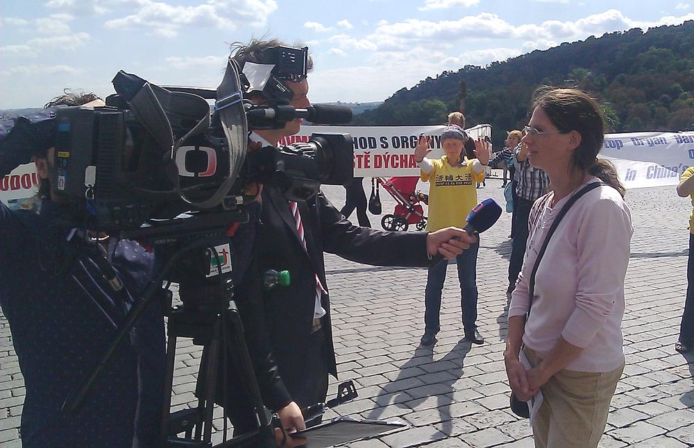 Reporter češke televizije intervjuira Falun Gong praktikanticu