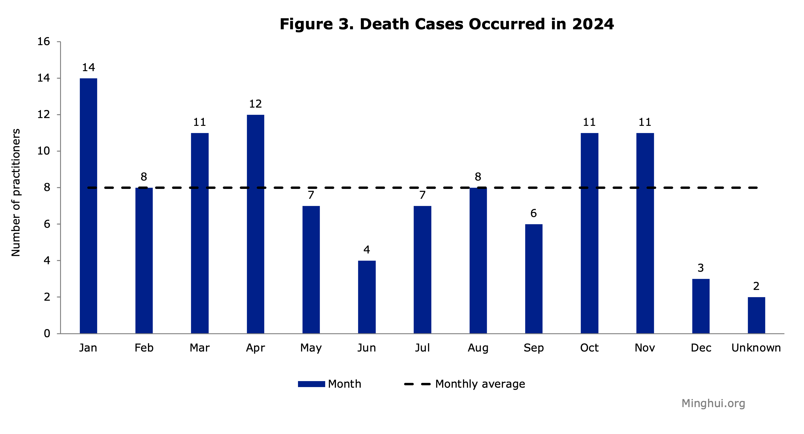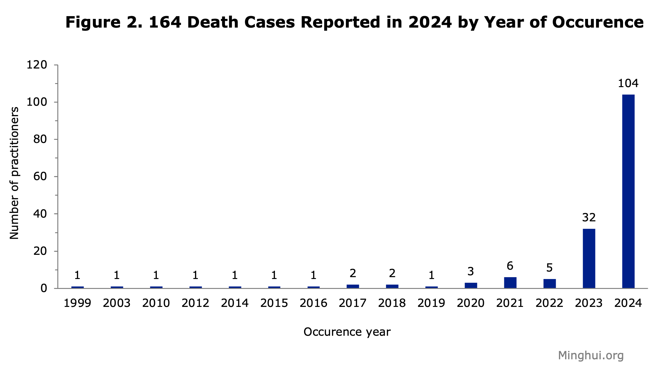 Među 164 novodokumentirana smrtna slučaja, 58 ih se dogodilo između 1999. i 2023., a preostala 104 tijekom 2024., s mjesečnim prosjekom od 8. U siječnju 2024. se bilježi najviše smrti (14), a slijedi travanj (12) te potom ožujak, listopad i studenom sa 11 zabilježena slučaja. Preostali mjeseci u 2024. bilježe jednoznamenkaste brojke. Zbog stroge cenzure informacija, slučajevi progona se ne mogu uvijek prijaviti na vrijeme, niti su informacije lako dostupne.