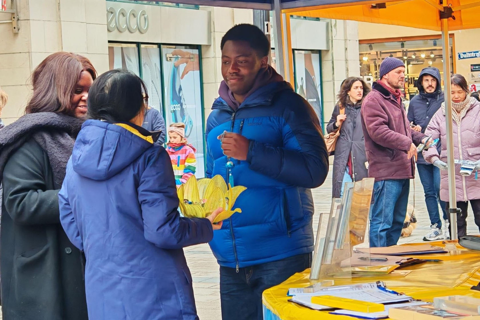 Praktikant mu je takođe dao mali origami cvet lotosa i rekao da na njemu piše „Falun Dafa je dobra, Istinitost-Blagost-Trpeljivost su dobri“ i objasnio da iako cvetovi lotosa rastu iz blata, oni nisu prljavi. Takođe je rekao da je današnje društvo poput blata u kome raste cvet lotosa. Kada ljudi rastu, uklanjaju loše faktore i podržavaju dobrotu, oni donose nadu. Kada je praktikant ovo rekao, čovek ga je iznenada snažno zagrlio, a lice mu je bilo ozareno od radosti. Njegova žena i drugi praktikanti su se smejali i bili dirnuti kao i on.