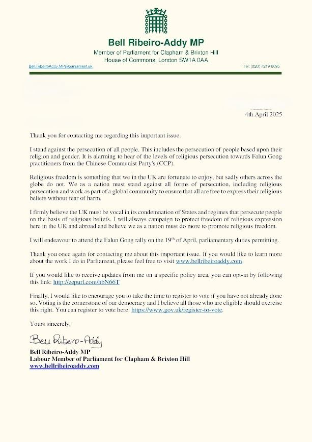 Mari Rimer, poslanica Parlamenta (MP), je u svom pismu izjavila: "Govorila sam u Parlamentu o progonu Falun Gonga, na debatama u Vestminster holu, i predložila amandmane na dva parlamentarna zakona. Imali smo određenog uspeha, ali ima još mnogo toga što treba da se uradi i što bi moglo da se uradi."