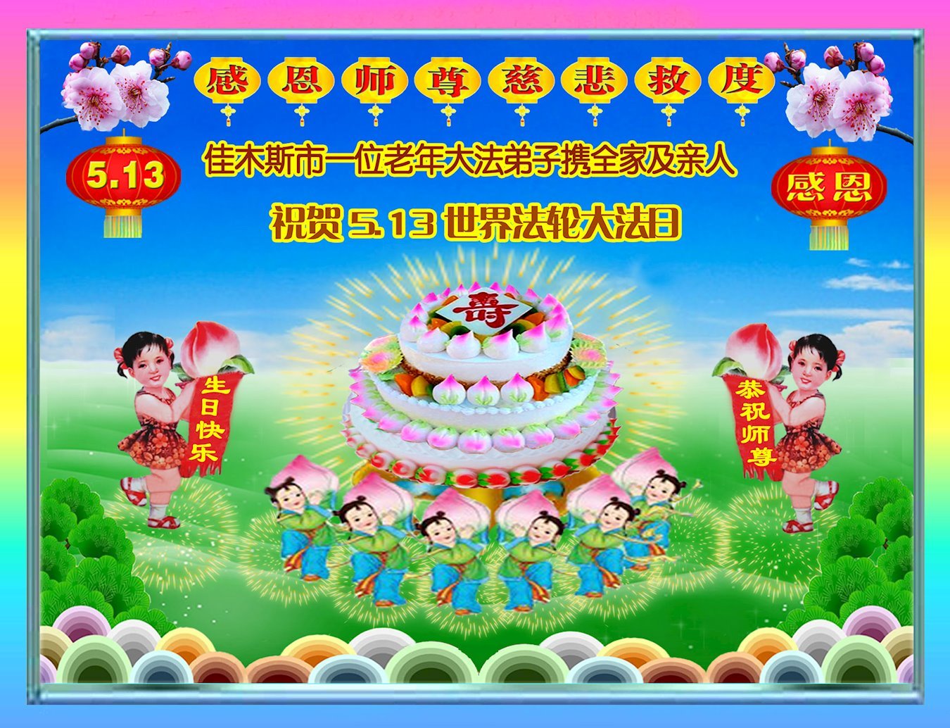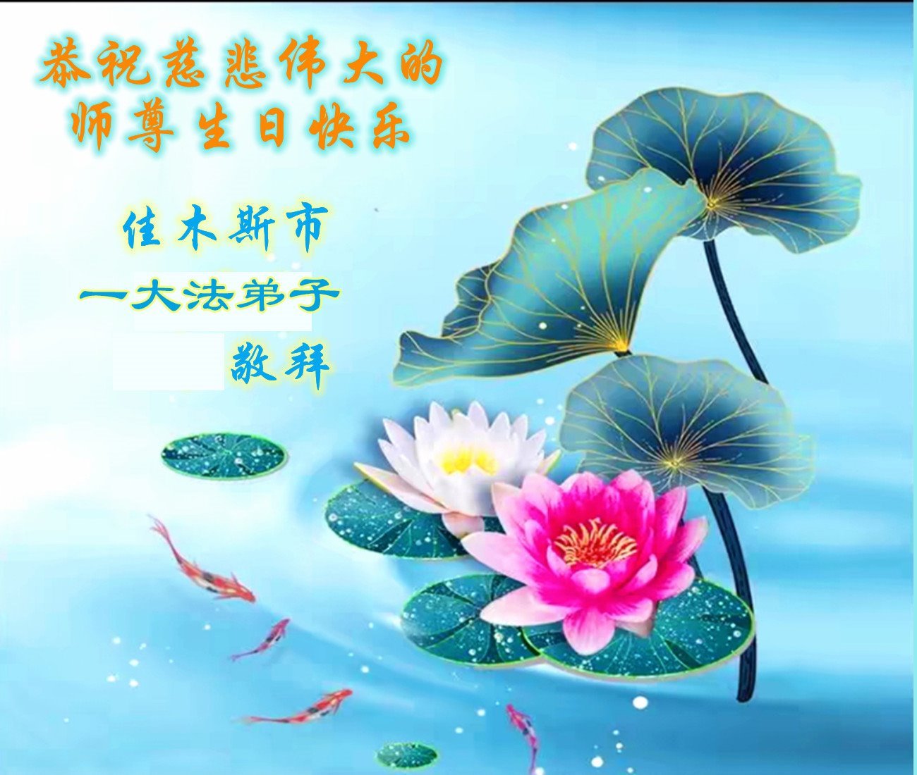 Praktikanti izražavaju svoju beskrajnu zahvalnost Učitelju Liju što je 1992. godine predstavio Falun Dafa javnosti te što ih vodi i štiti na njihovom putu kultivacije. Čestitaju Učitelju Liju sretan rođendan i obećaju da će se čvrsto kultivirati te probuditi savjest još većeg broja ljudi kako bi bili dostojni Učiteljevog mukotrpnog spasenja.