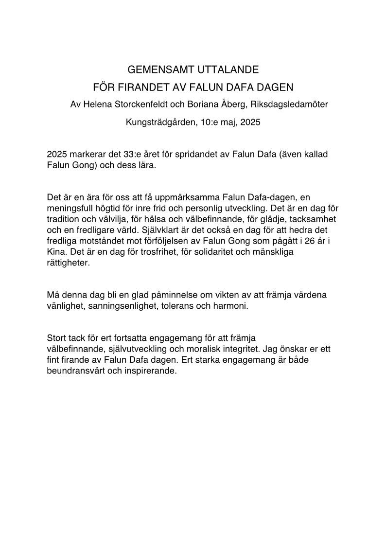 Poslanica Helena Štorkenfeldt i poslanica Borjana Oberg napisale su: „2025. godina obeležava 33. godinu širenja Falun Dafe (takođe poznatog kao Falun Gong) i njegovih učenja.