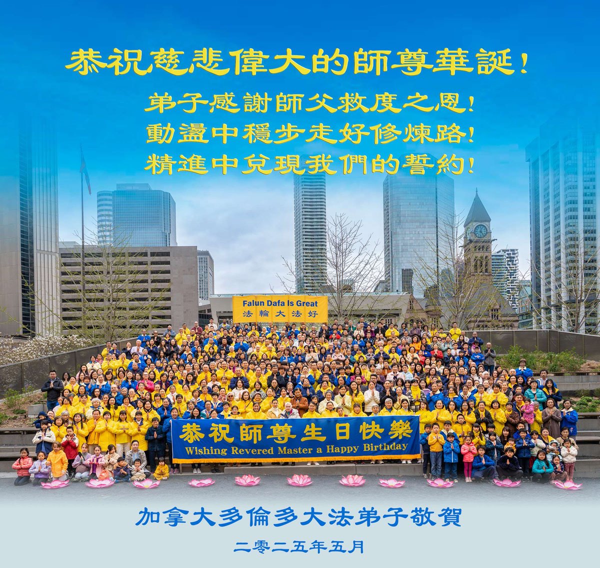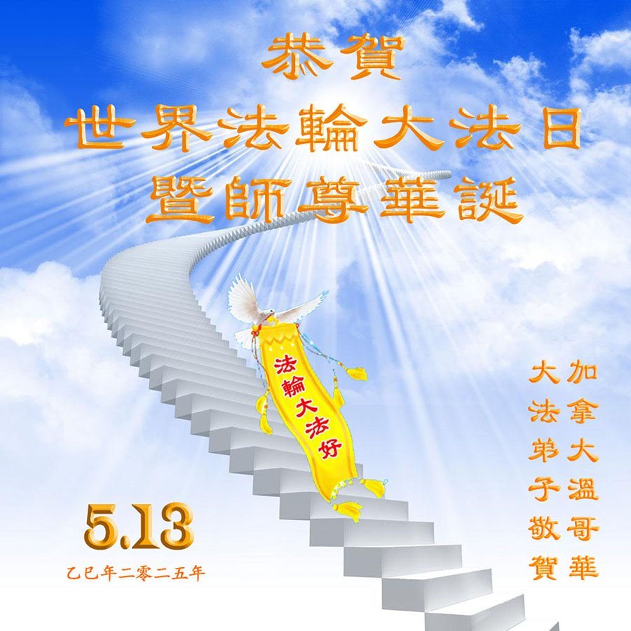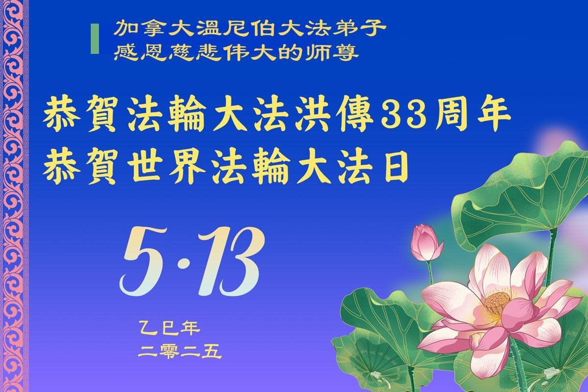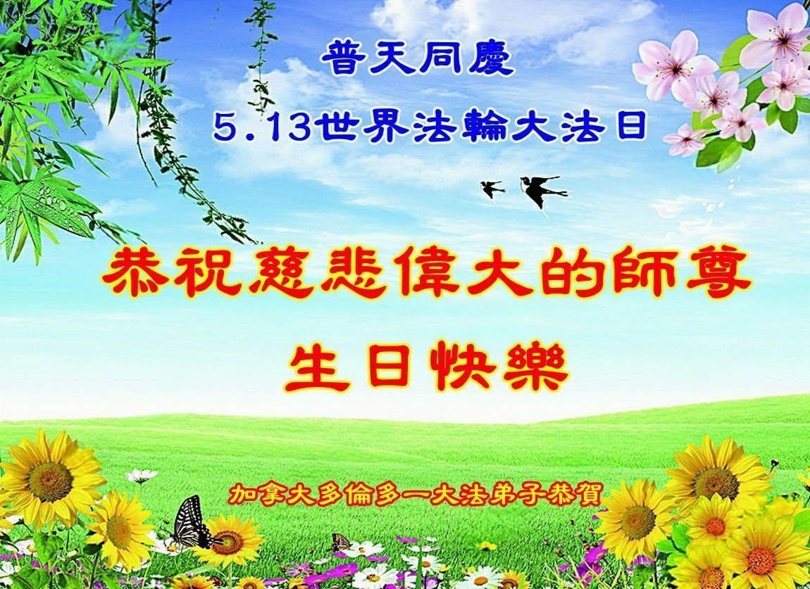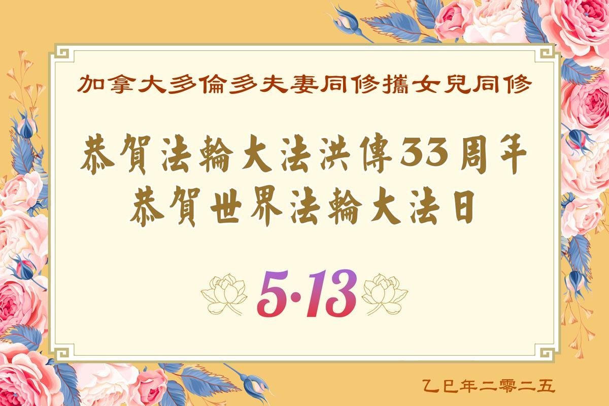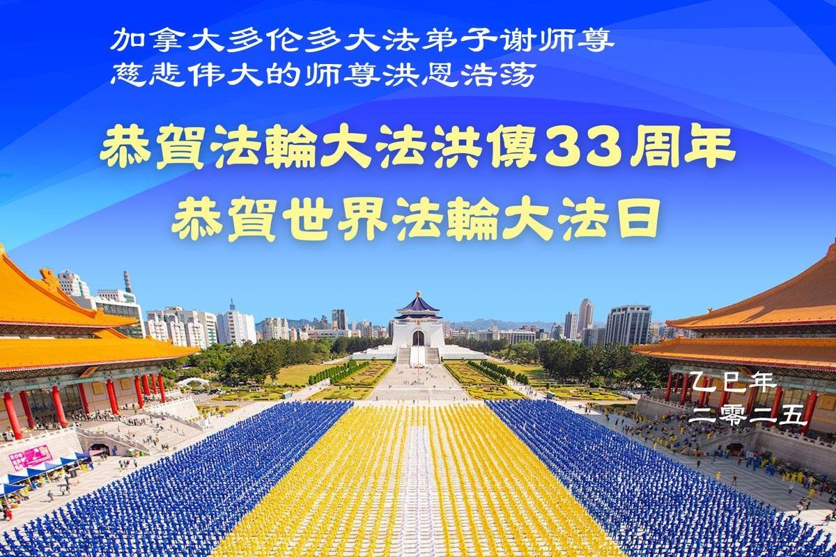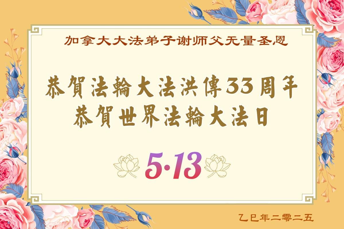 Praktikanti u Kanadi slave Svetski dan Falun Dafe i 33. godišnjicu predstavljanja Falun Dafe javnosti. Takođe s poštovanjem žele poštovanom Učitelju srećan rođendan i izražavaju zahvalnost za Učiteljevo saosećajno spasenje.