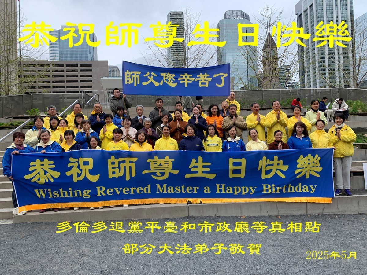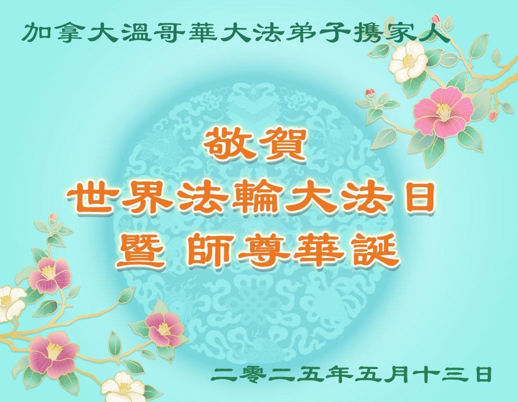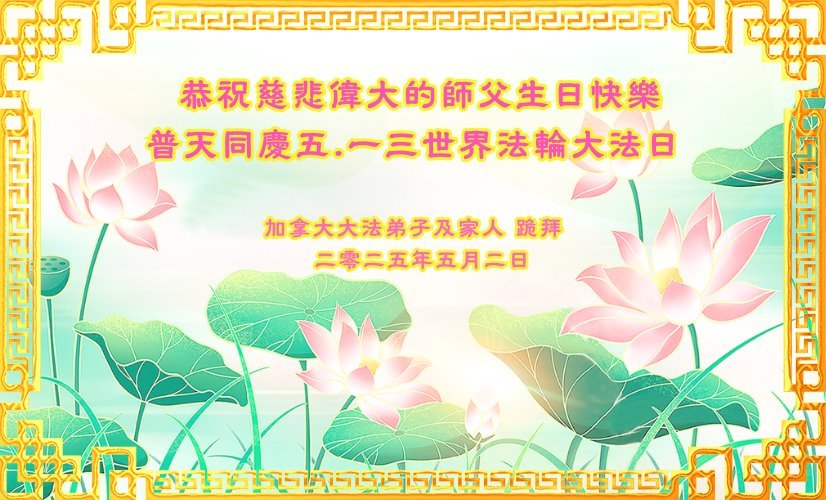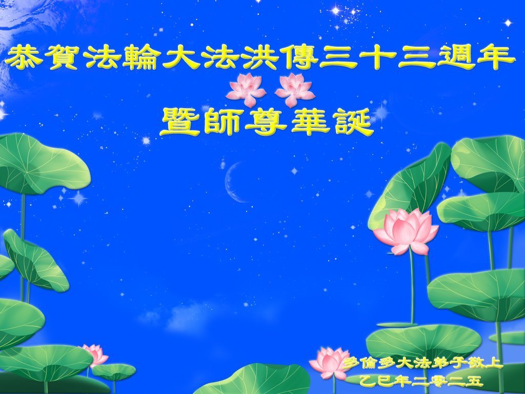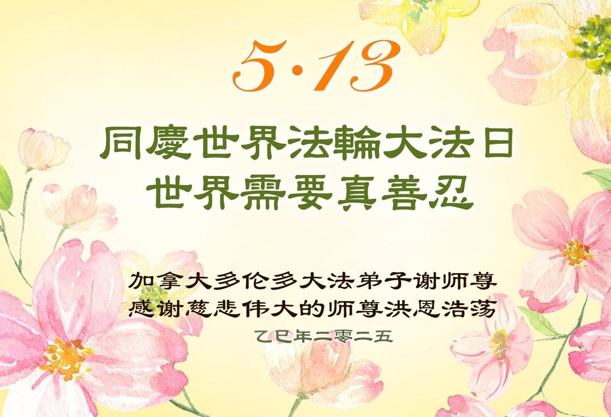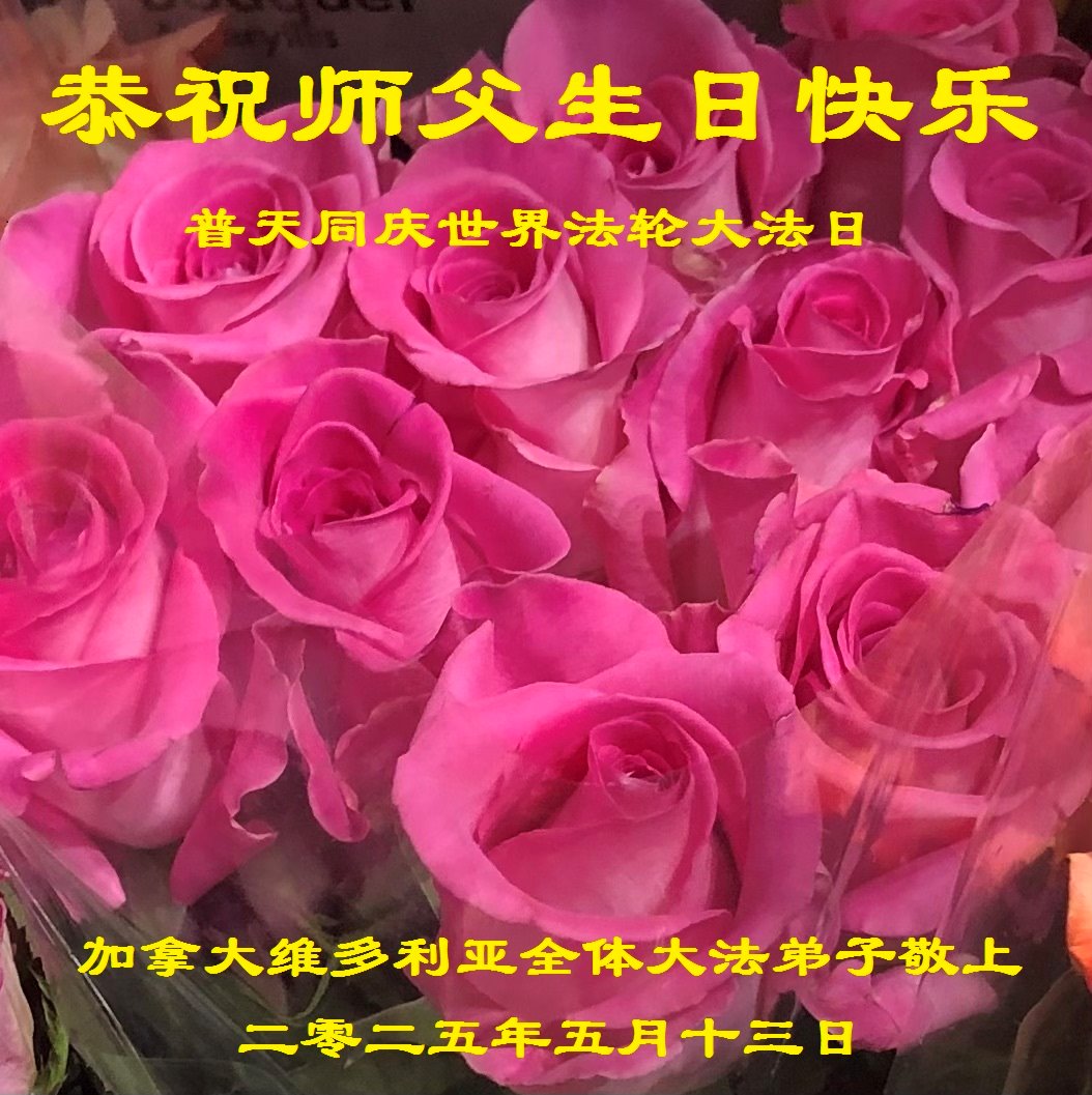 Praktikanti u Kanadi slave Svetski dan Falun Dafe i 33. godišnjicu predstavljanja Falun Dafe javnosti. Takođe s poštovanjem žele poštovanom Učitelju srećan rođendan i izražavaju zahvalnost za Učiteljevo saosećajno spasenje.