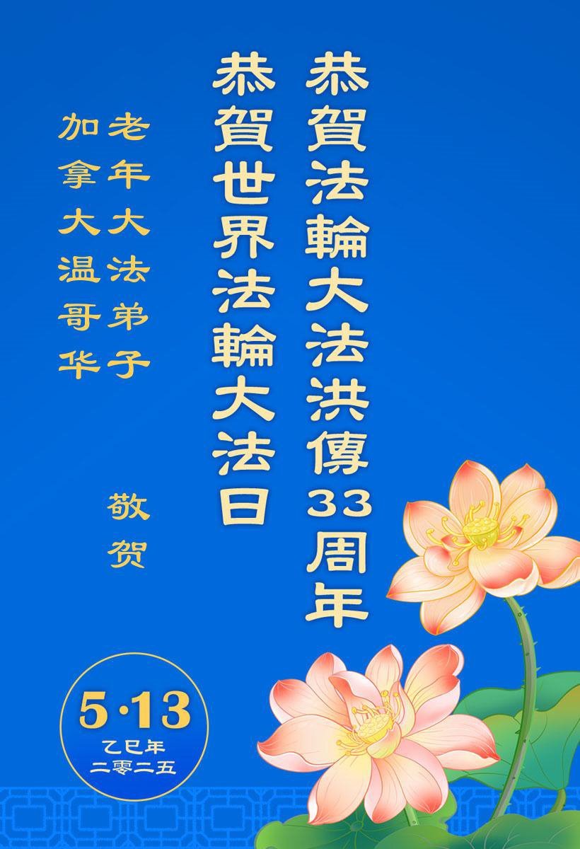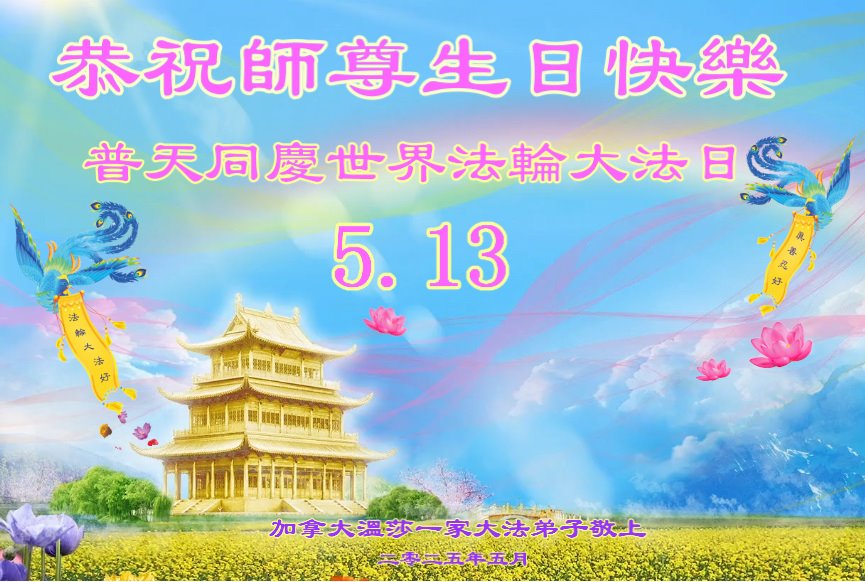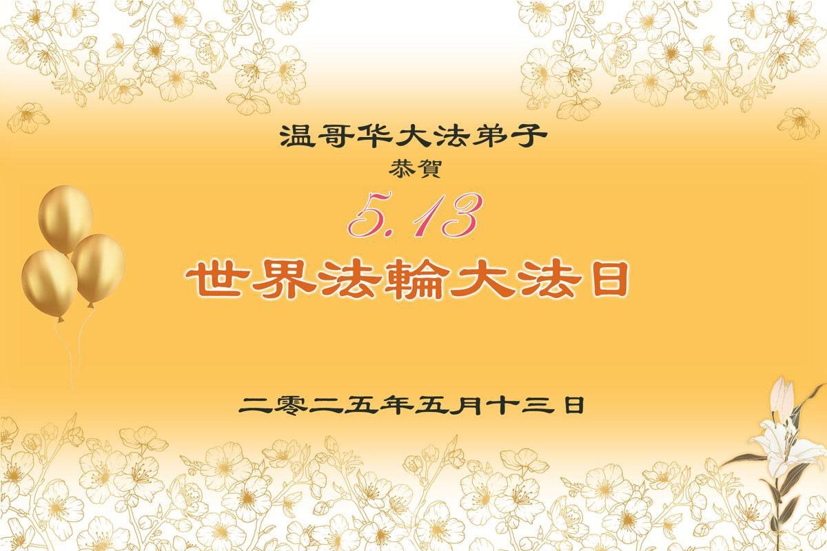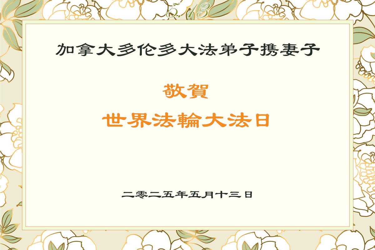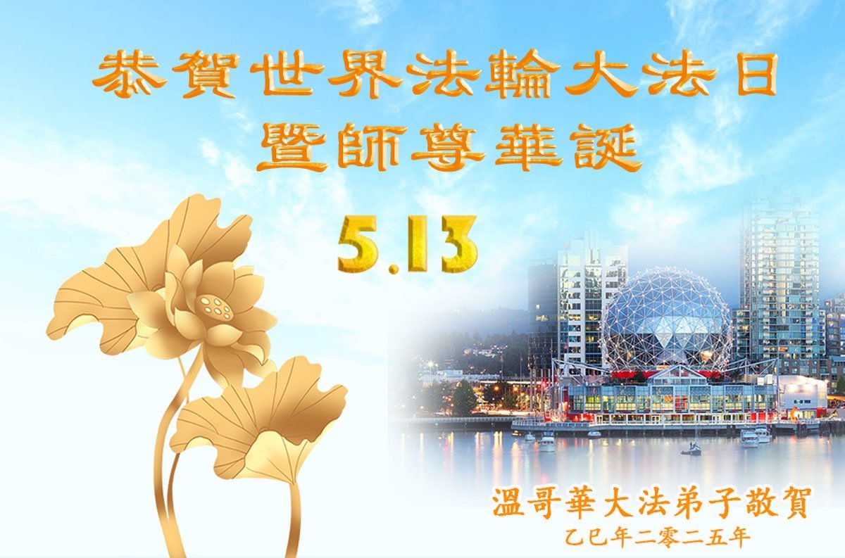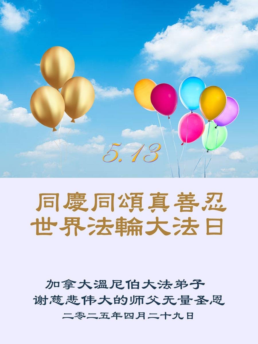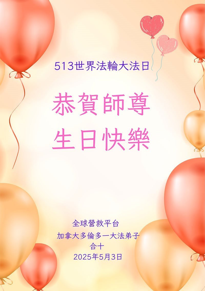 Praktikanti u Kanadi slave Svetski dan Falun Dafe i 33. godišnjicu predstavljanja Falun Dafe javnosti. Takođe s poštovanjem žele poštovanom Učitelju srećan rođendan i izražavaju zahvalnost za Učiteljevo saosećajno spasenje.