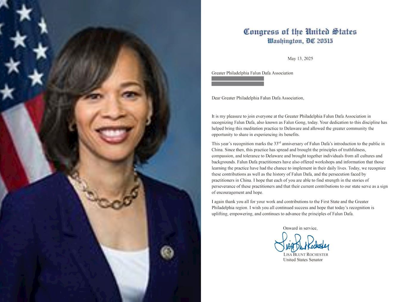 Senatorica Lisa Blunt Rochester iz Delawarea je poslala pozdravno pismo u kojem se navodi: „Ovogodišnjim priznanjem obilježava se 33. godišnjica predstavljanja Falun Dafa javnosti u Kini. Od tada se ova praksa proširila i donijela principe Istinitosti, Dobrodušnosti i Tolerancije u Delaware, te okupila pojedince iz svih kultura i porijekla.”