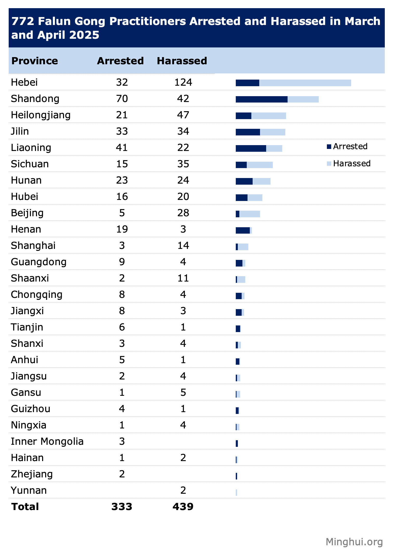 Od 772 slučaja, 333 su hapšenja (od kojih se 61 dogodilo 2024. a 272 u 2025. godini) i 439 slučajeva maltretiranja (od kojih su 123 incidenta bila 2024. a 422 u 2025. godini). Kašnjenje u izveštavanju uglavnom je posledica cenzure informacija u Kini pod komunističkim režimom, što otežava Minghui dopisnicima da prikupe, provere i pošalju podatke na veb stranicu. Praktikanti koji su bili proganjani takođe se suočavaju sa opasnošću od vladine odmazde kada prijavljuju progon koristeći svoja prava imena.