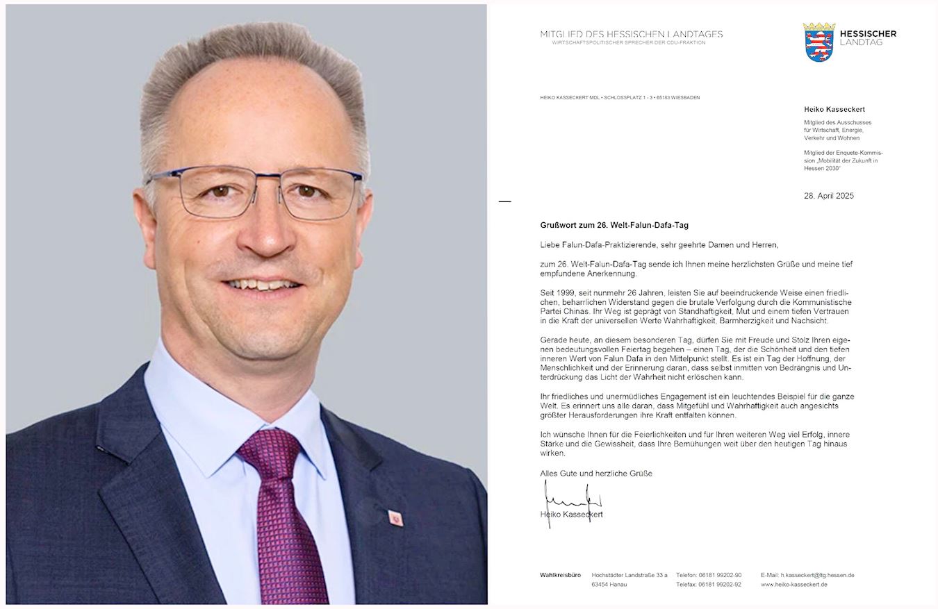 Hajko Kasekert, poslanik Parlamenta pokrajine Hesen, napisao je: „Povodom 26. Svetskog dana Falun Dafe, šaljem vam svoje najtoplije pozdrave i najdublje poštovanje.